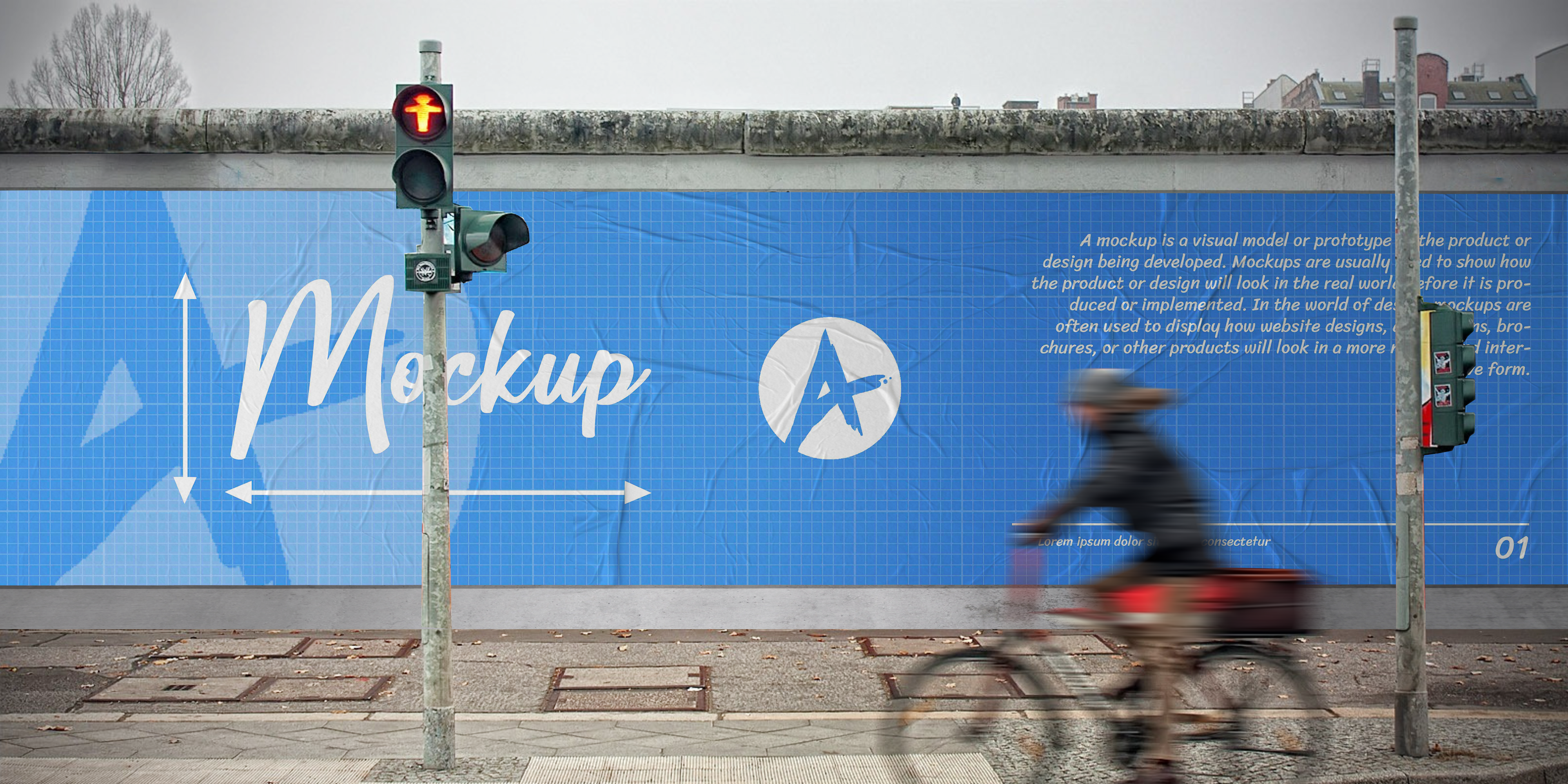 The mockup image portrays an urban street setting with a cyclist riding past and a large blue billboard on a concrete wall. The billboard includes design elements of a white circular logo and arrows indicating dimensions. The background shows a dimly lit, overcast day with bare trees and buildings. This mockup can be used for advertising by showcasing marketing materials in a cityscape context. Create your unique designs with our mockup generator and share them on social media to boost engagement!