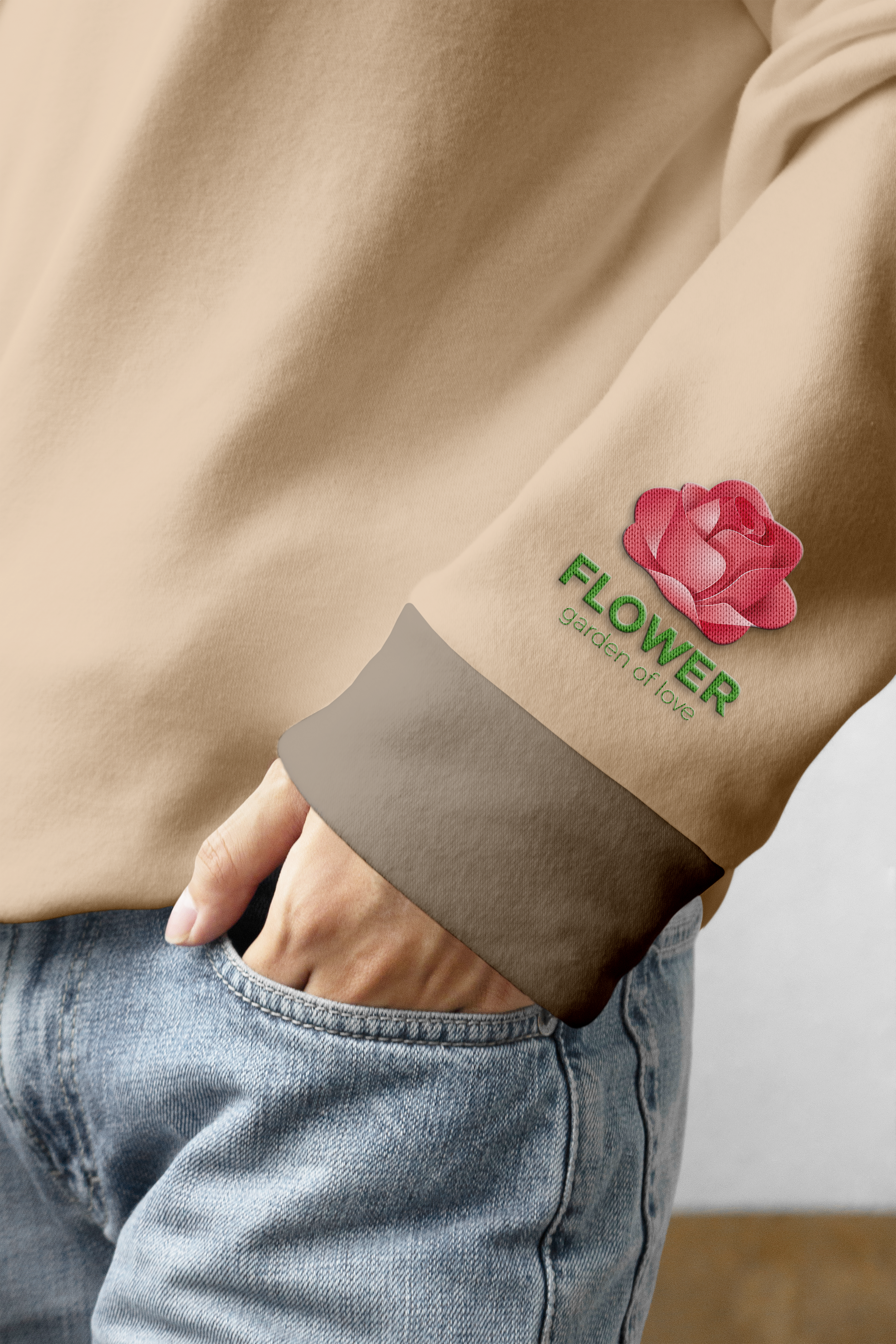 The mockup image presents a close-up of a person wearing a beige sweatshirt featuring a red rose graphic on the sleeve, accompanied by green text. The setting is casual, with the background subtly blurred, focusing on the garment's design. The person has one hand in the pocket of light blue jeans, enhancing the relaxed vibe. This mockup is ideal for advertising custom apparel, showcasing design intricacies. Use the mockup generator to create unique clothing designs and share them on social media now!