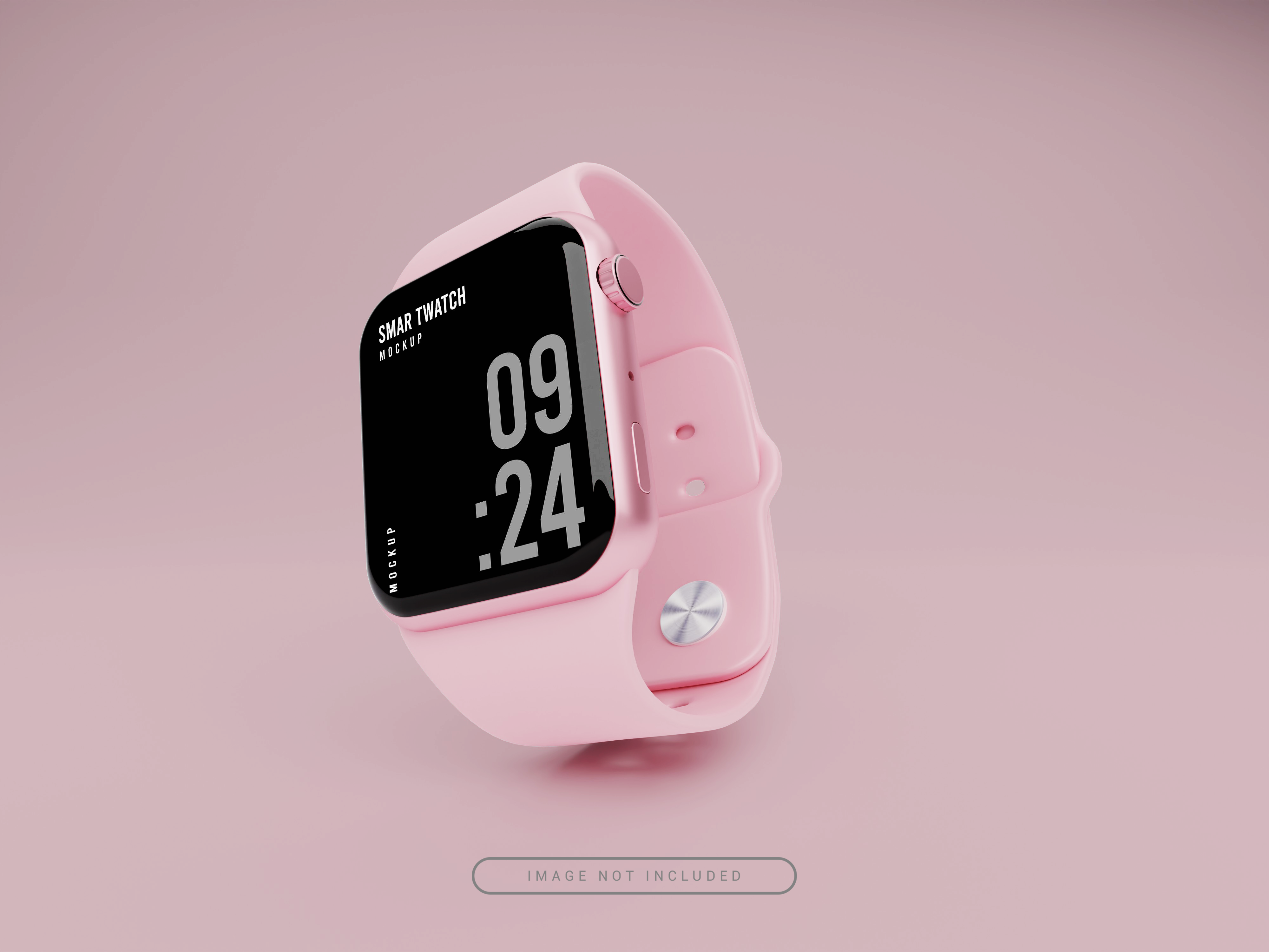 The mockup showcases a sleek smartwatch with a pale pink strap set against a matching pink gradient background. The watch features a square face with minimalistic design elements, including a large digital time display and a metallic side button. This stylish, modern aesthetic makes it ideal for advertising tech wearables or fashion accessories. Use this mockup generator to visualize your smartwatch designs and share your creative works on social media to engage your audience and boost brand visibility!