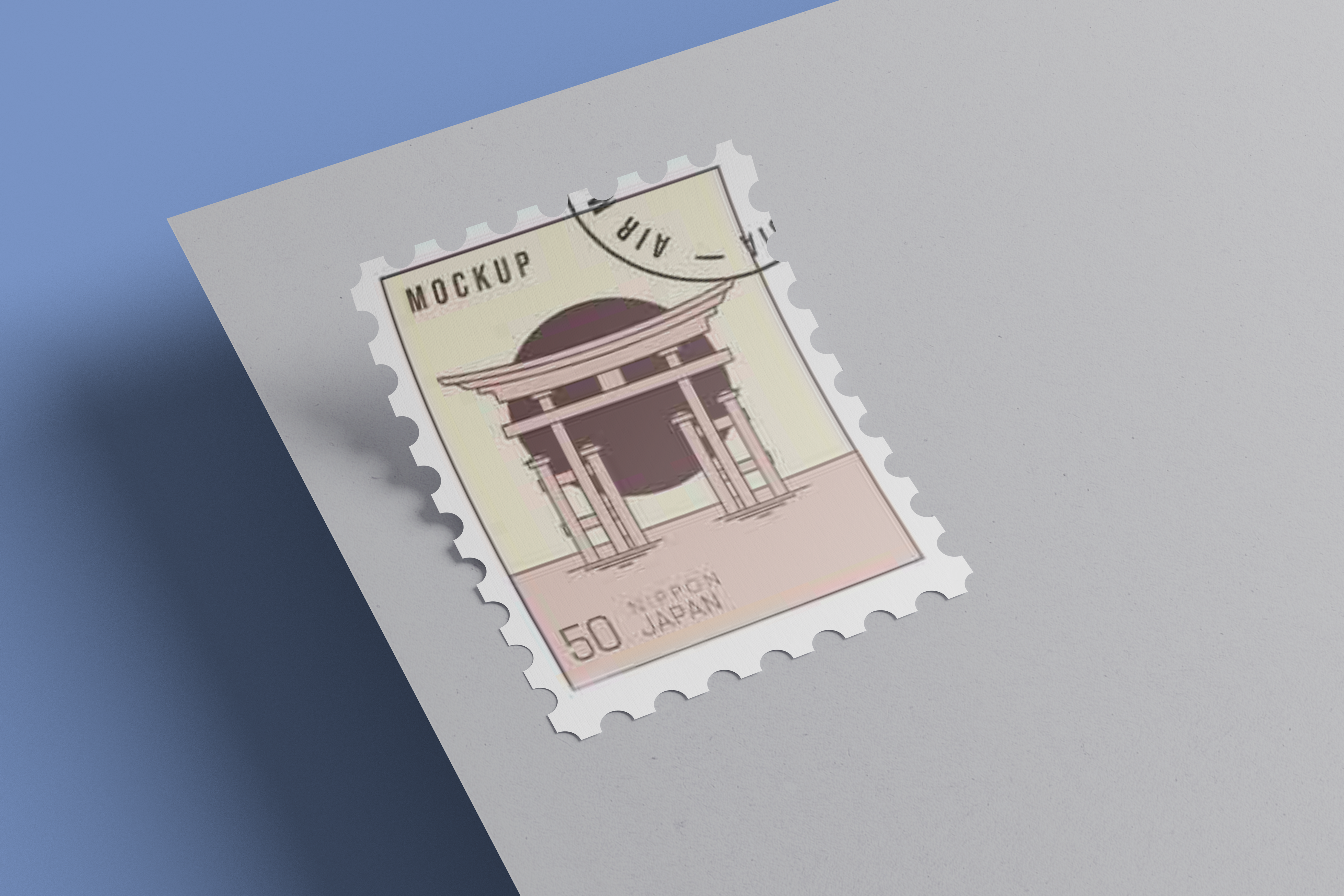 This mockup presents a classic postage stamp set against a smooth, pastel-toned backdrop that transitions from grey to blue. The stamp depicts a traditional Japanese torii gate against a sunset. The detailed design elements include perforated edges and a postal mark. This mockup is ideal for advertising travel services or cultural products. Get creative with this mockup generator and share your customized stamp design on social media to captivate your audience!