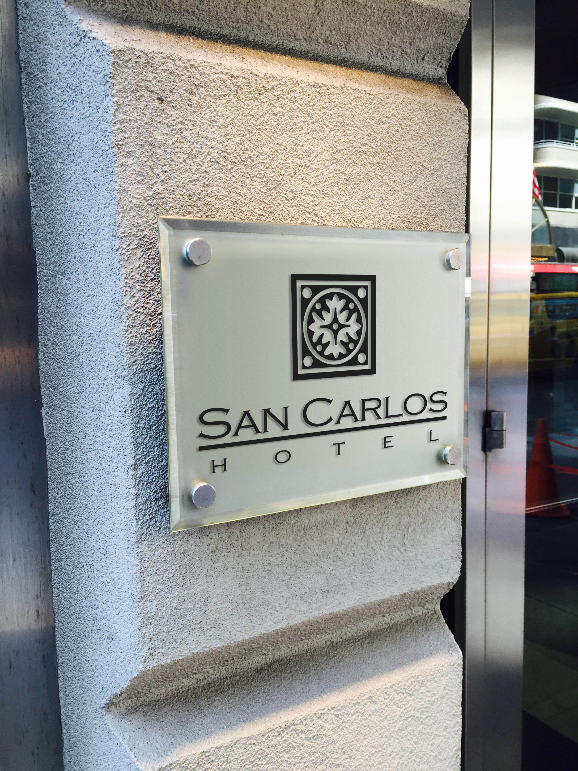 A qr code and the logo of "San Carlos Hotel" inscribed on a sleek metallic plaque mounted on a textured wall as part of a mockup template.