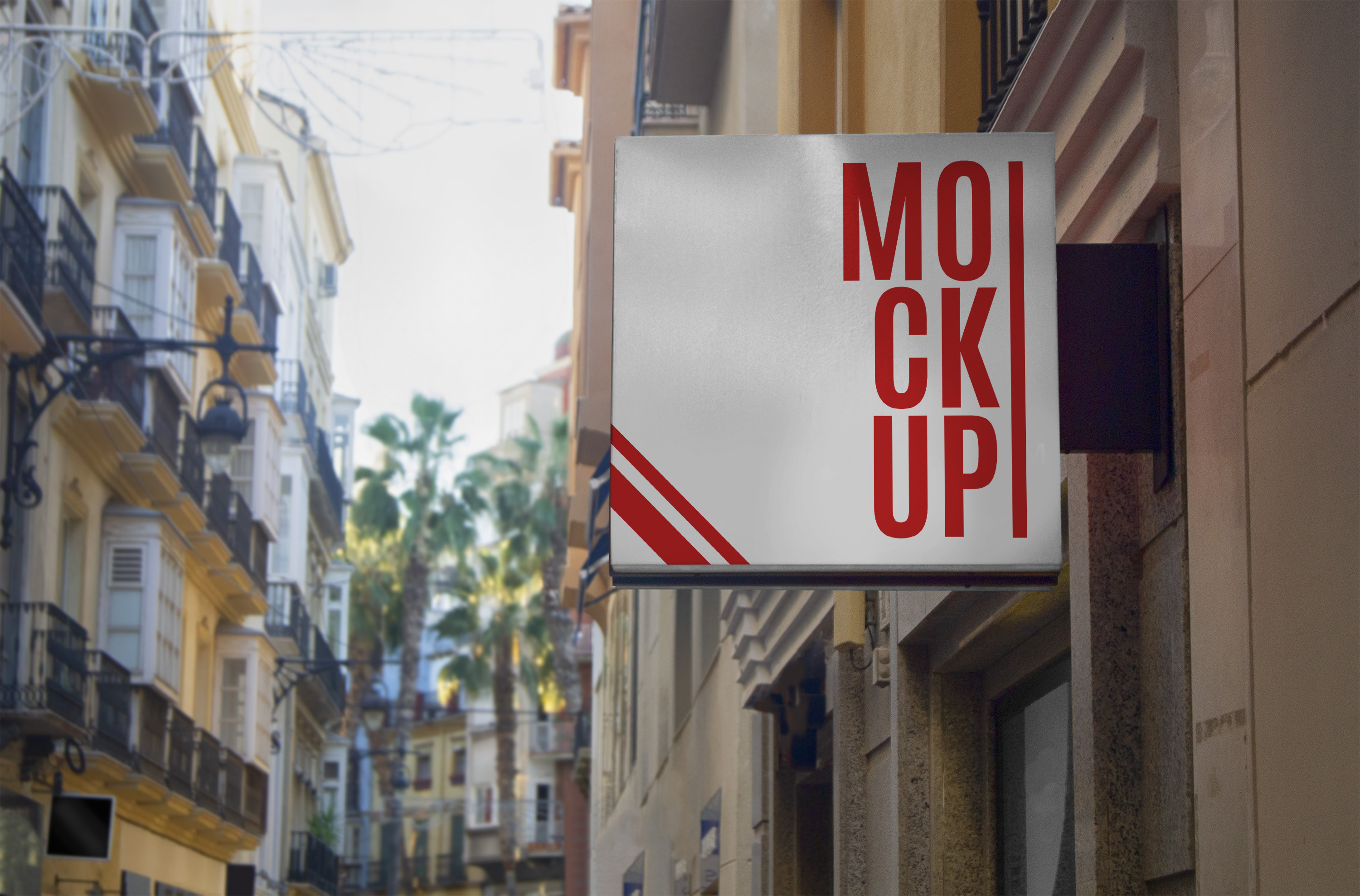 A rectangular sign featuring "MOCKUP" in red and black letters hangs on a building wall in a narrow street, serving as an ideal template for designers. The street is lined with other buildings and trees, creating a quaint urban setting.
