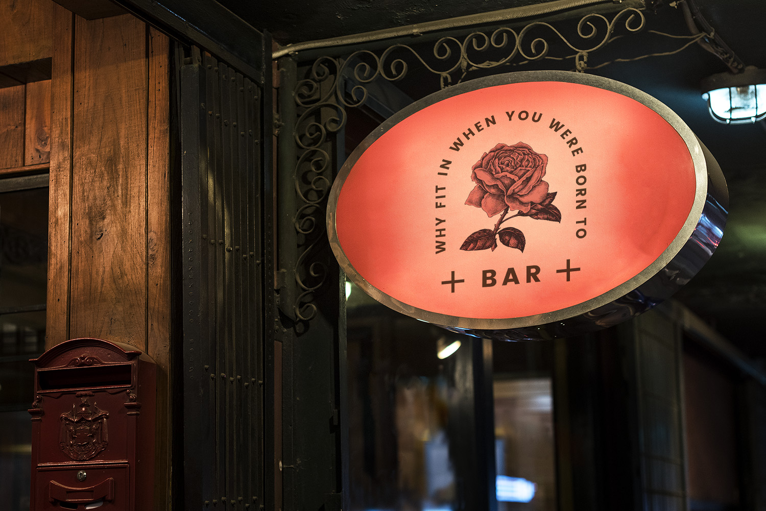 A red oval sign with a rose design and the text "Once in a while you meet someone" is mounted on a wooden wall, creating an elegant template next to a vintage-style mailbox.