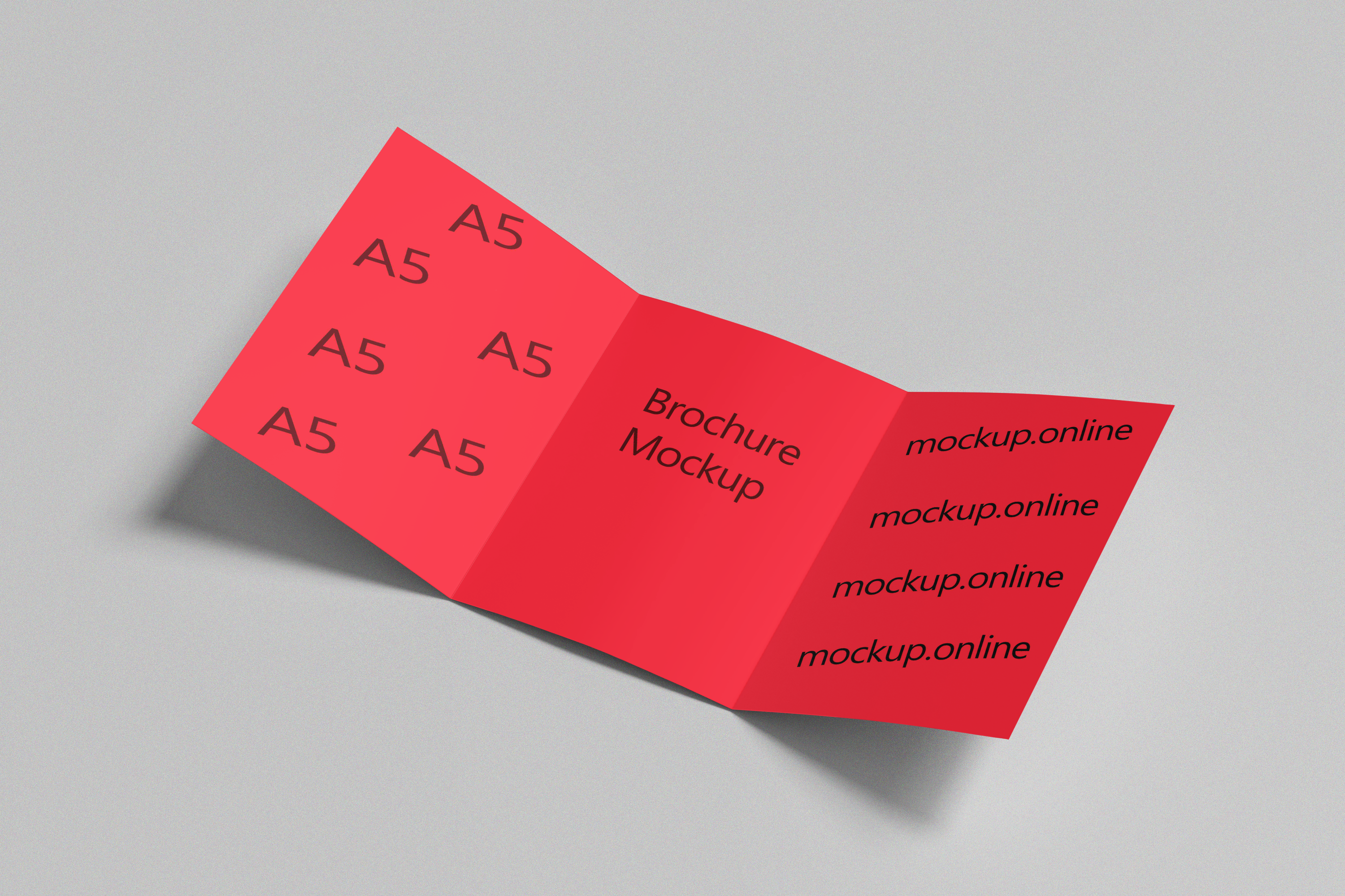 The image showcases an A5 brochure mockup in a simple, light grey setting. The tri-fold brochure is fully opened, displaying vibrant red interior sections with black text and placeholders. This minimalistic design is perfect for visualizing and promoting your marketing materials, ensuring your content stands out. Use this mockup generator to create enticing brochure designs and share your unique creations on social media to captivate your audience. Try it now and unleash your creative potential!