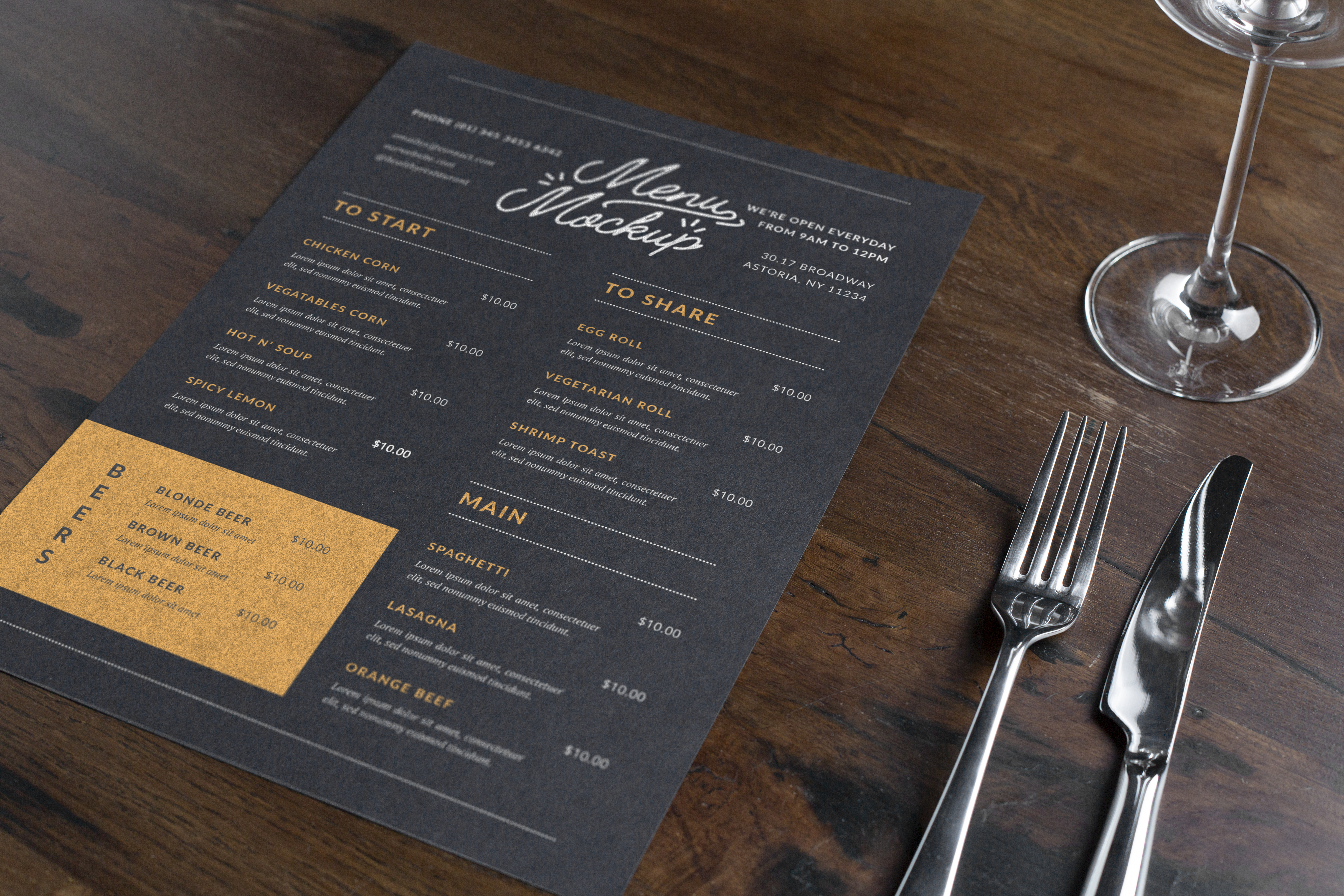 This mockup image showcases a restaurant table setting with a neatly designed menu placed on a rustic wooden surface. The menu features a sophisticated dark background with sections for starters, shared plates, and main courses, accented with a bold yellow area highlighting beer options. A shiny fork, knife, and a wine glass add elegance to the scene. Perfect for advertising new menu designs, this mockup is ideal for restaurants looking to refresh their look. Try our mockup generator today and share your unique design on social media!