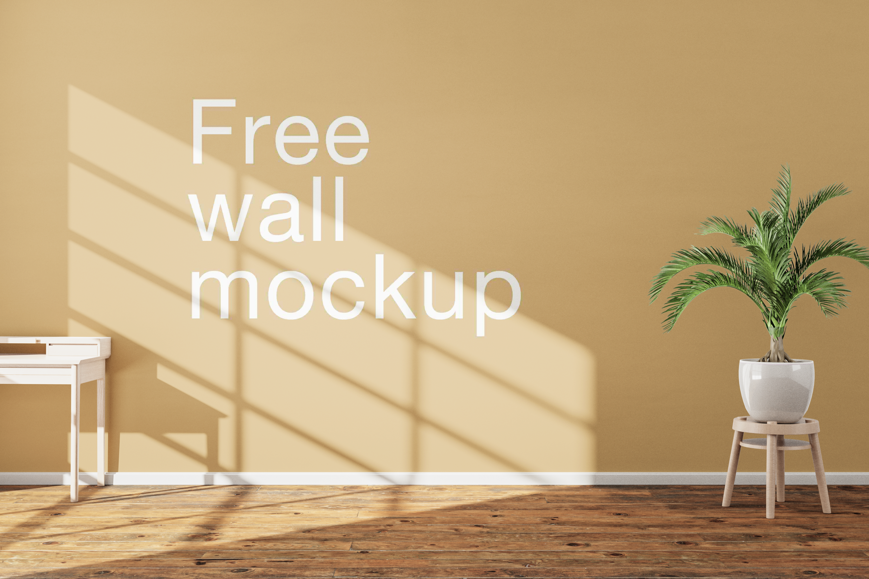 A room with plain walls featuring the text "free wall mockup," a small table with a plant in a white vase, and soft shadows cast by a window.