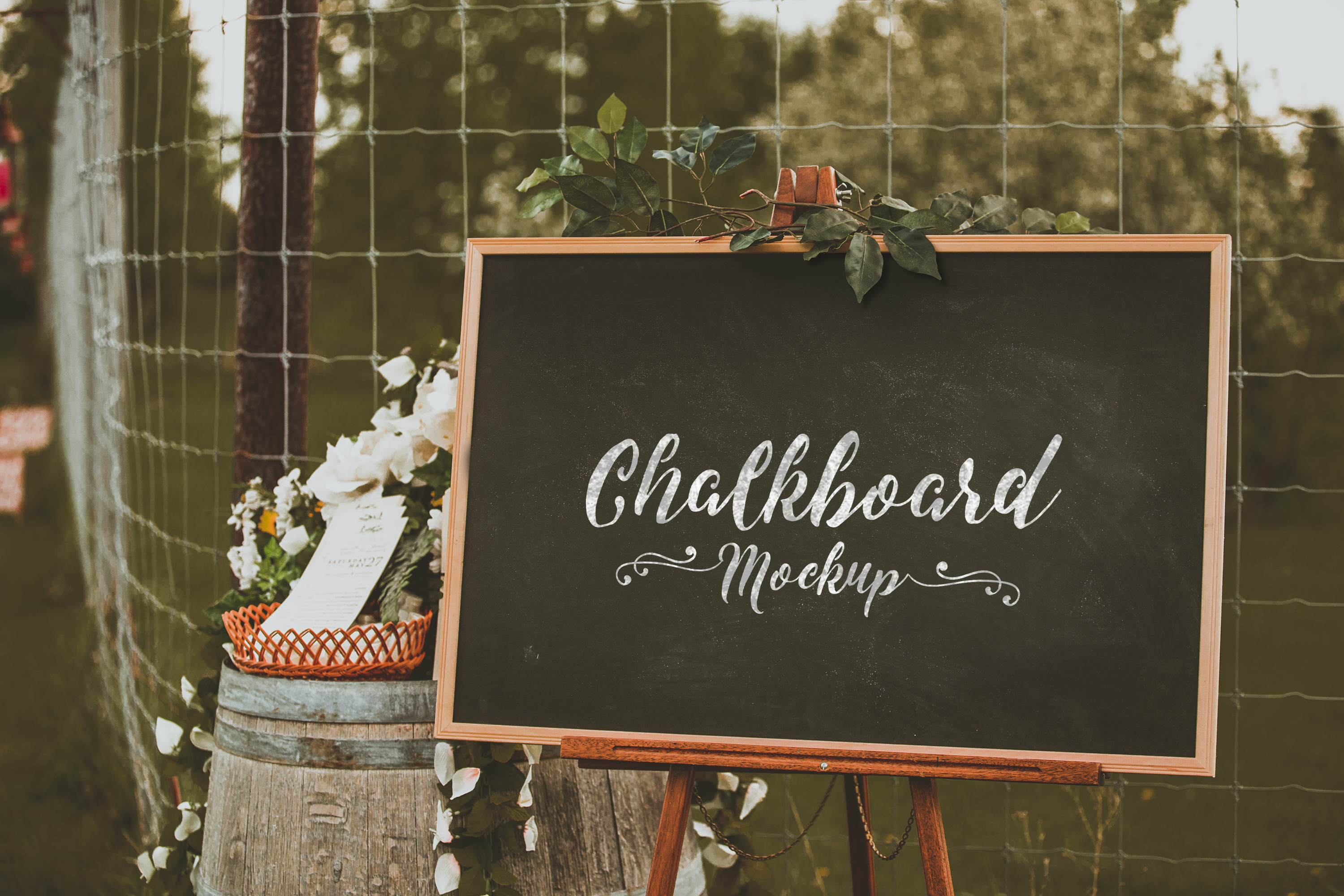 This mockup features a chalkboard set outdoors against a rusty fence and green foliage backdrop. Positioned on a wooden easel, the chalkboard displays elegant, decorative text. Surrounding the board are charming elements like ivy vines and a rustic barrel with white flowers. Ideal for advertising events, announcements, or stylish restaurant menus, this mockup offers an inviting and rustic appeal. Use our mockup generator to craft your unique design and share your creative vision on social media today!