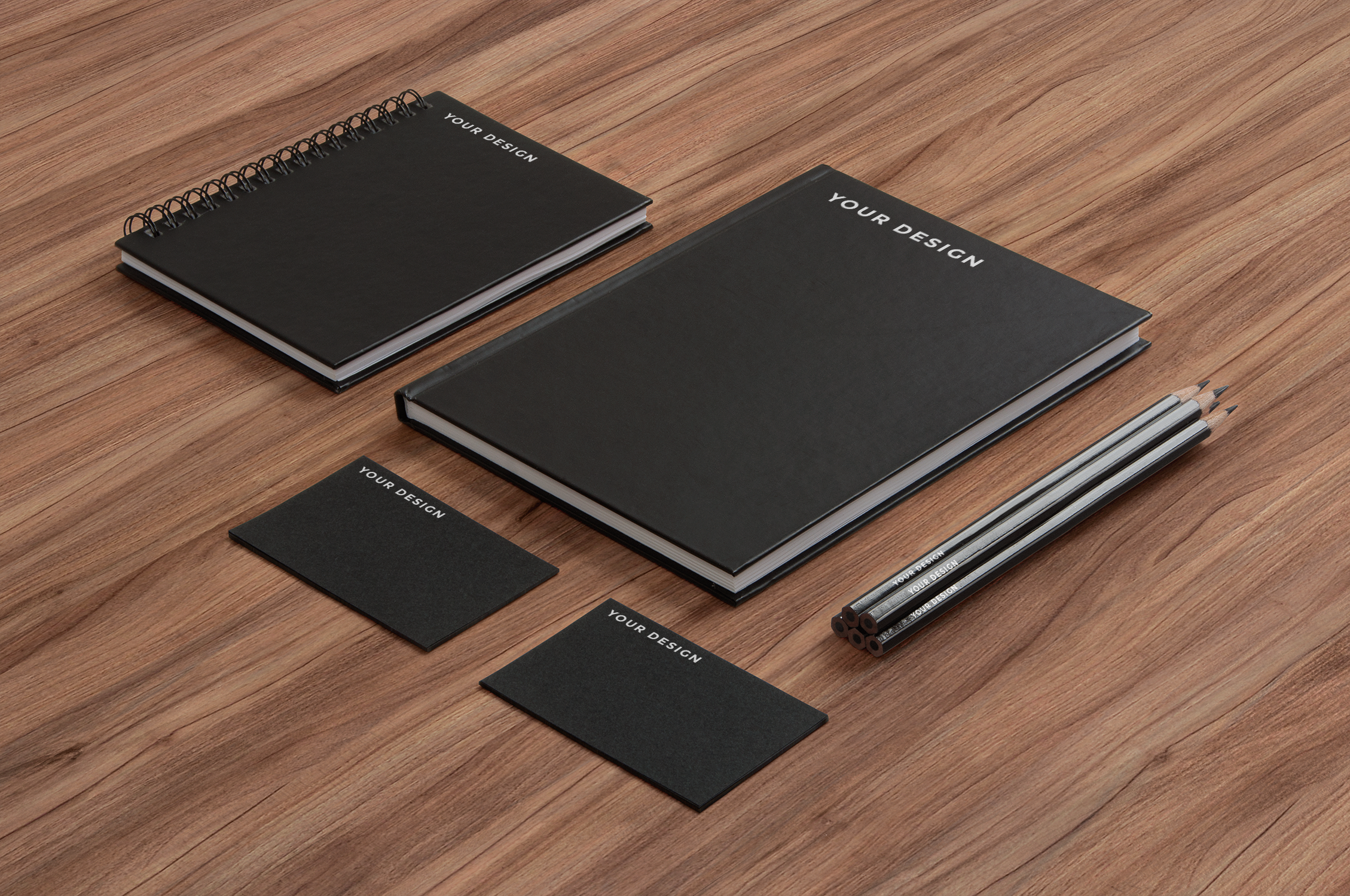 The mockup image displays a professional setting with a wooden background. The main objects consist of a hardcover book, a spiral notebook, pencils, and two business cards, all in a sleek, black design. The minimalist white text on each item adds a sophisticated touch. This mockup is ideal for advertising stationery or business branding materials. Utilize the mockup generator to showcase your design and share your unique creation on social media to attract attention and potential clients.