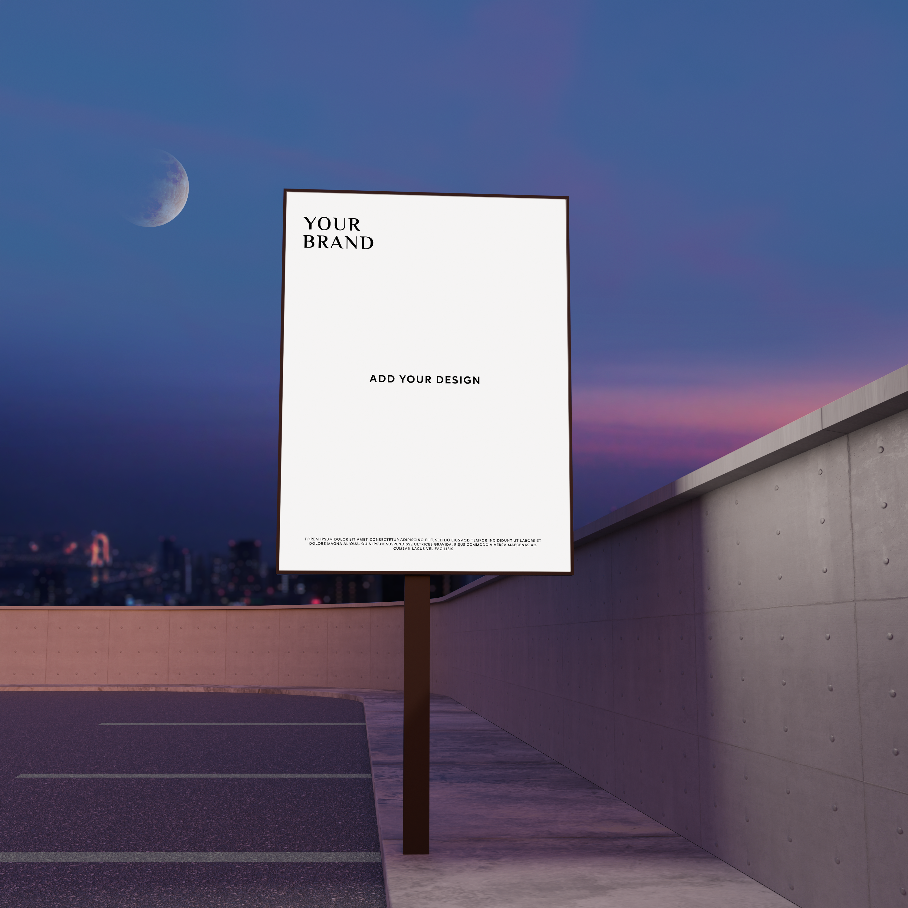 This mockup features a large vertical billboard set against an evening rooftop parking lot. The backdrop showcases a serene night sky with a crescent moon and a distant city skyline. The main object is a rectangular billboard with a clean, white space ready for custom design, framed by a thin border. Leverage this mockup to visualize impactful advertisements in an urban setting. Use the mockup generator now and share your stunning design on social media to captivate your audience!