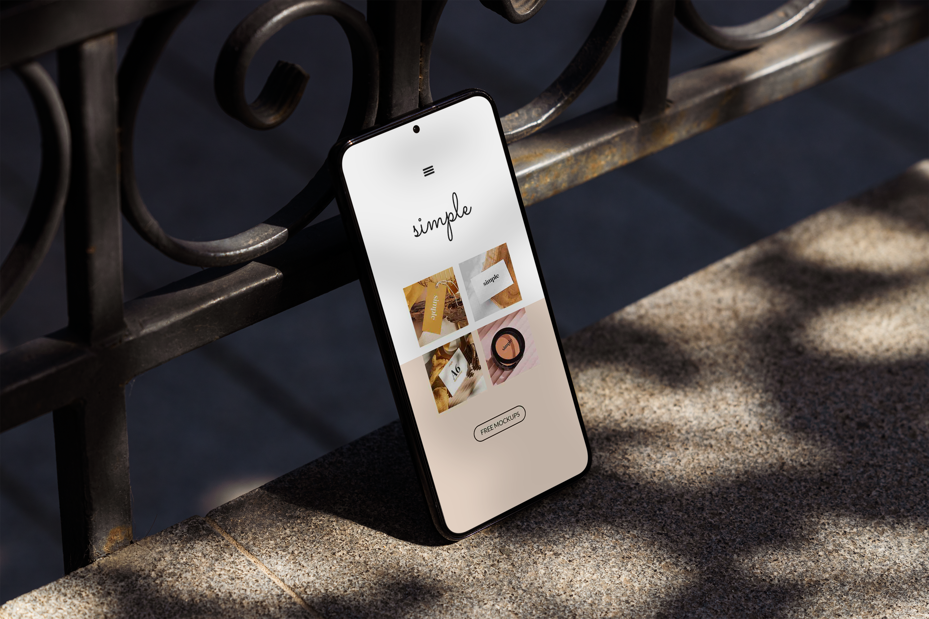 The mockup image shows a smartphone leaning against a wrought iron railing in an outdoor setting with a sunlit stone surface. The phone display showcases a minimalist design featuring four images arranged in a grid with clean, simple lines and a neutral color palette. This mockup is perfect for advertising your app, website, or design portfolio in a relatable, real-world context. Use our mockup generator to create stunning designs and share your creations on social media today!