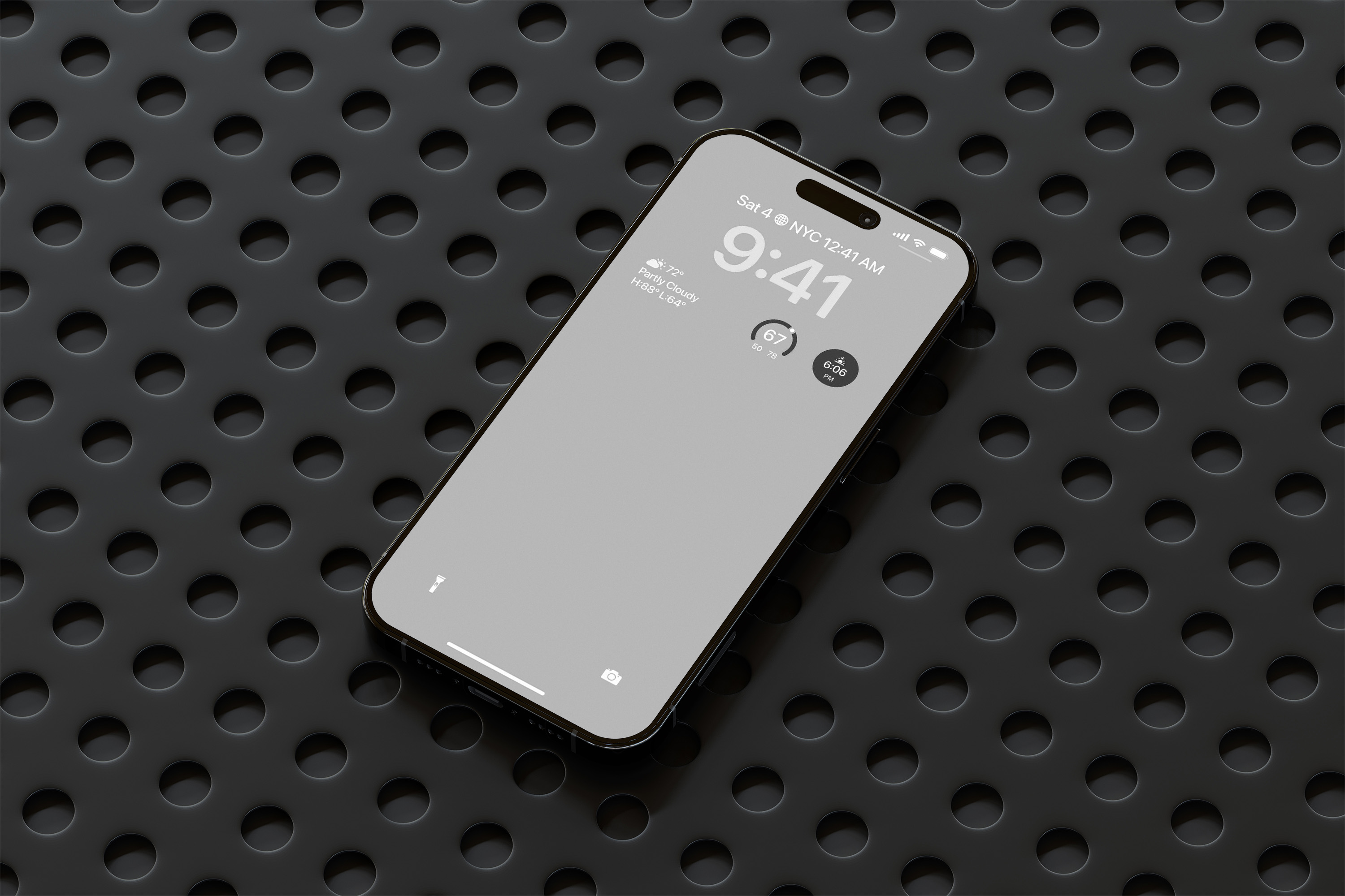 A smartphone mockup with a white screen displaying the time and date lies on a black, perforated surface.