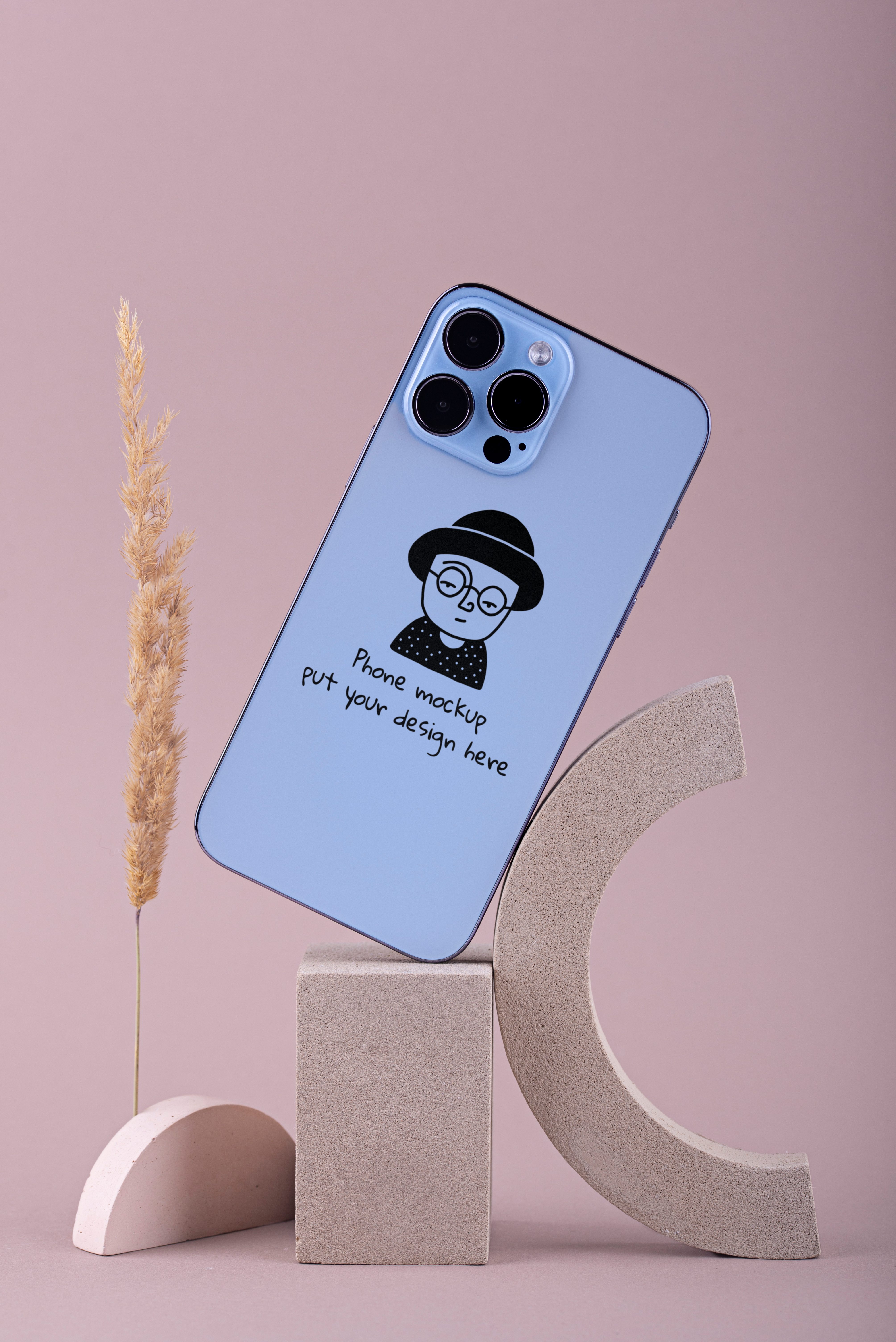 This mockup showcases a sleek smartphone with a clean, minimalist design displayed against a soft pink background. The phone rests on geometric stone stands, giving it an elegant and balanced appearance. A simple illustration decorates the back panel, making it perfect for displaying custom case designs. Ideal for advertising, this mockup highlights your personalized phone case ideas in a visually appealing way. Use our mockup generator to create stunning designs and share them on your social media to captivate your audience!
