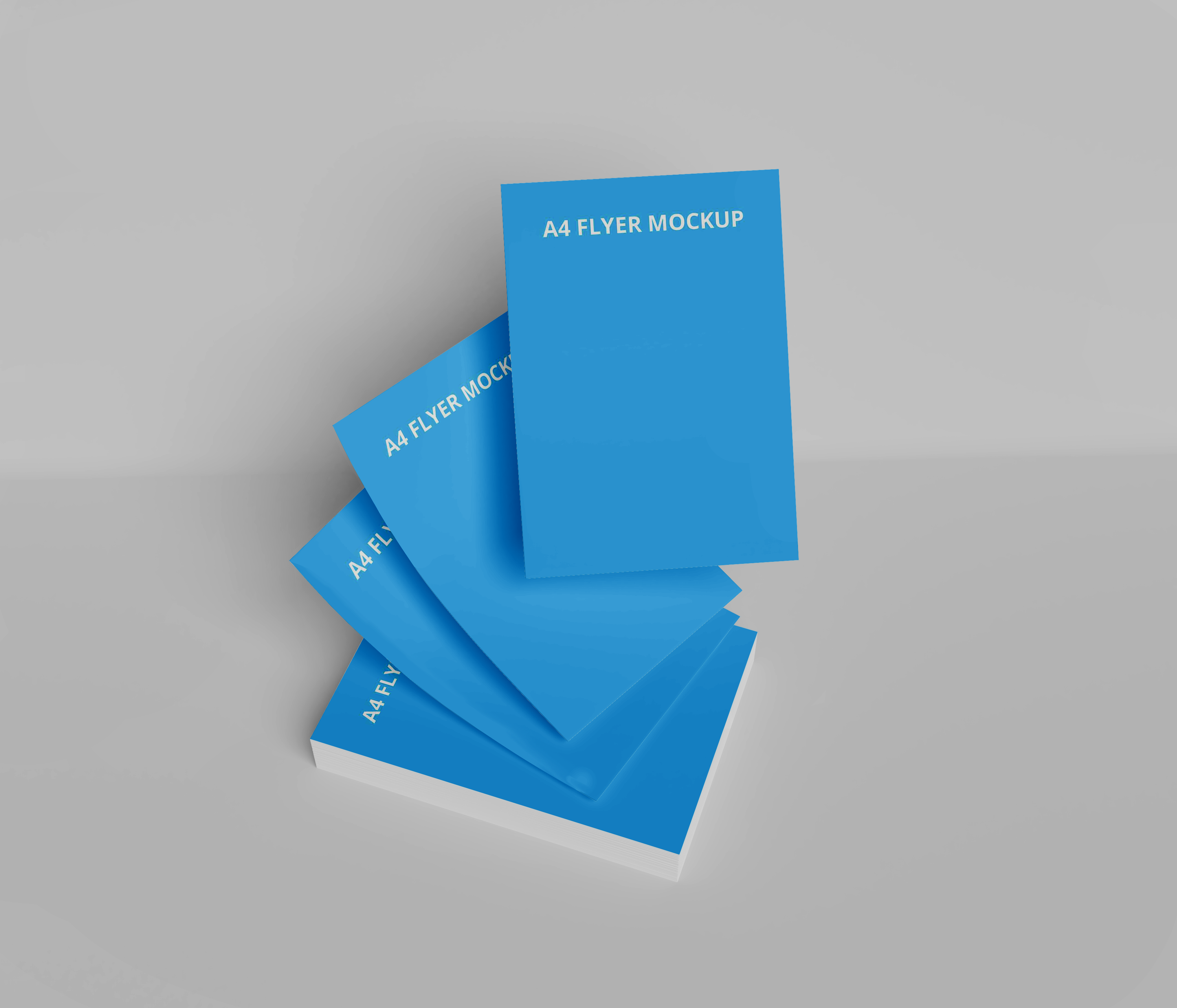 This mockup image shows a sleek stack of A4 flyers against a minimalistic, light grey background. The main objects are vivid blue flyers, neatly arranged to showcase their front covers. The design elements are straightforward and clean, making it perfect for advertising needs, such as promoting events, products, or services. Use this mockup generator to create your own compelling designs and share them on social media for broader outreach. Act now and leverage this tool to elevate your brand!