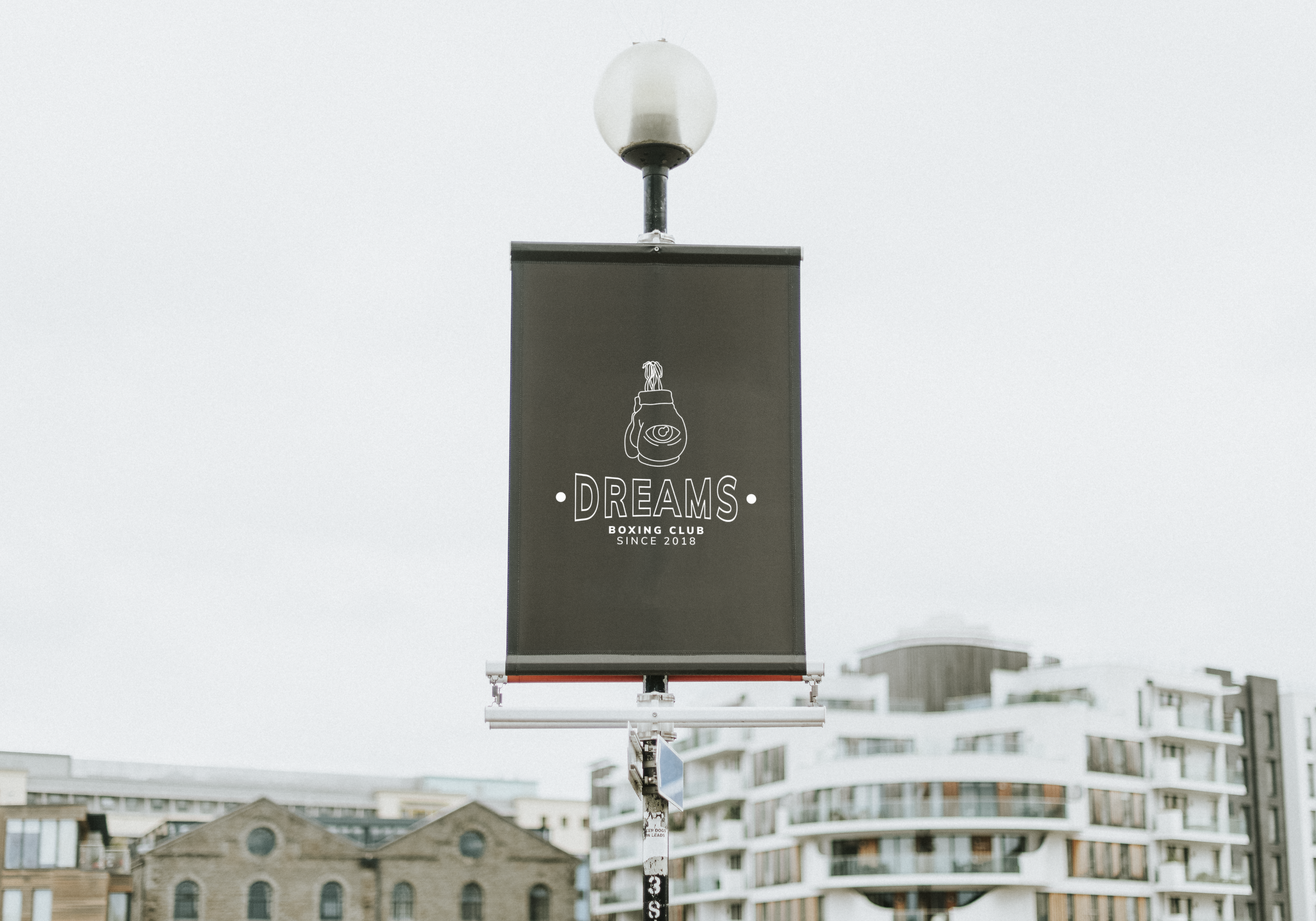 The mockup image features a street pole banner set against an urban backdrop with modern and historical buildings. The banner, suspended from a lamppost, showcases a sleek black design with a white illustration of boxing gloves and minimalistic text. This eye-catching mockup is ideal for promoting businesses or events, especially in sports or fitness. Use the mockup generator to create impactful ads and share your designs on social media to boost visibility and engagement!