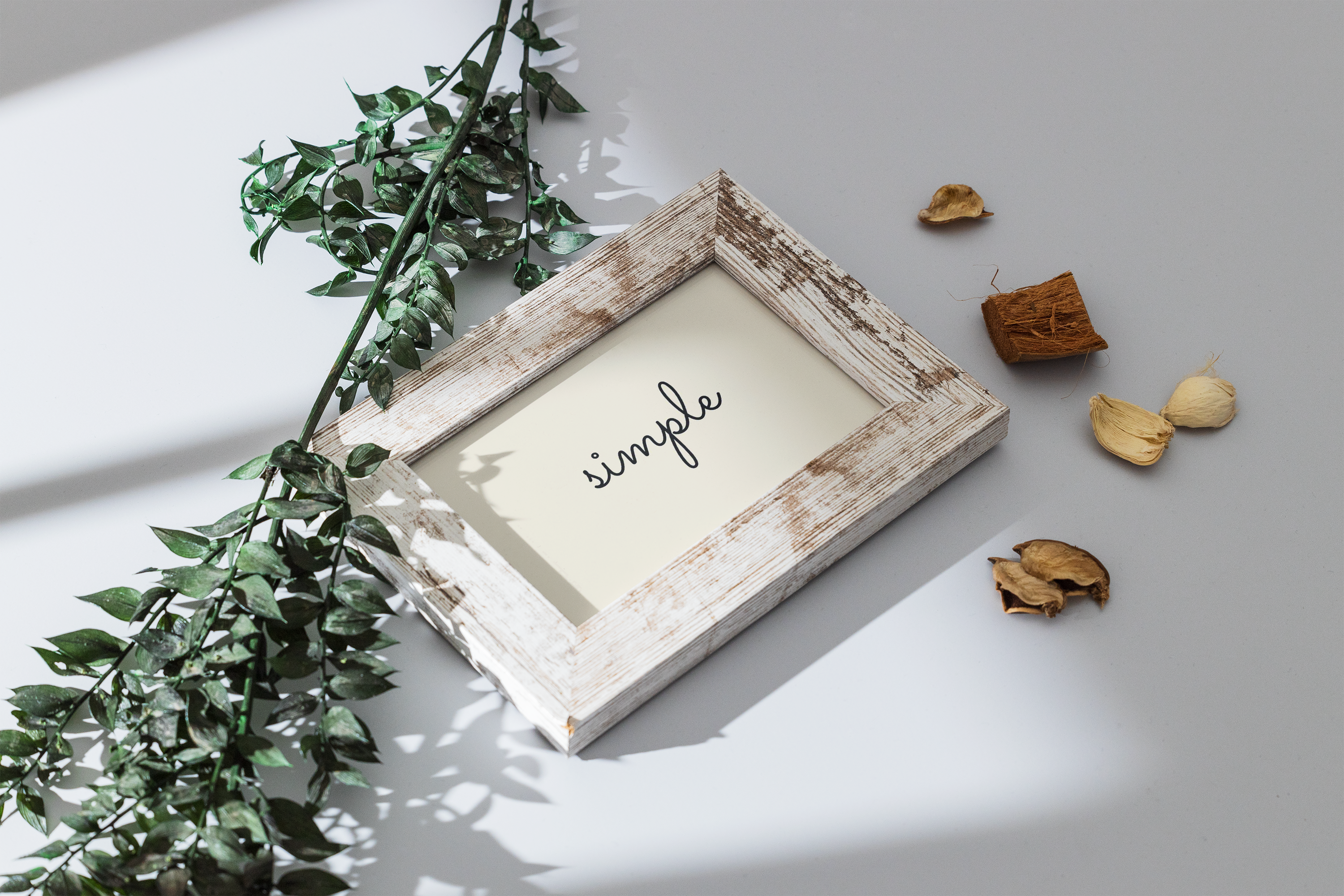 The mockup image showcases a rustic photo frame with a distressed wooden texture, set on a light grey background. Surrounding the frame, there are green leafy branches and scattered dried plant decorations, enhancing a natural and minimalistic feel. This mockup is perfect for advertising art prints, inspirational quotes, or photography. Utilize our mockup generator to personalize your design and share your creative visuals on social media to captivate your audience. Get started now and see the impact!