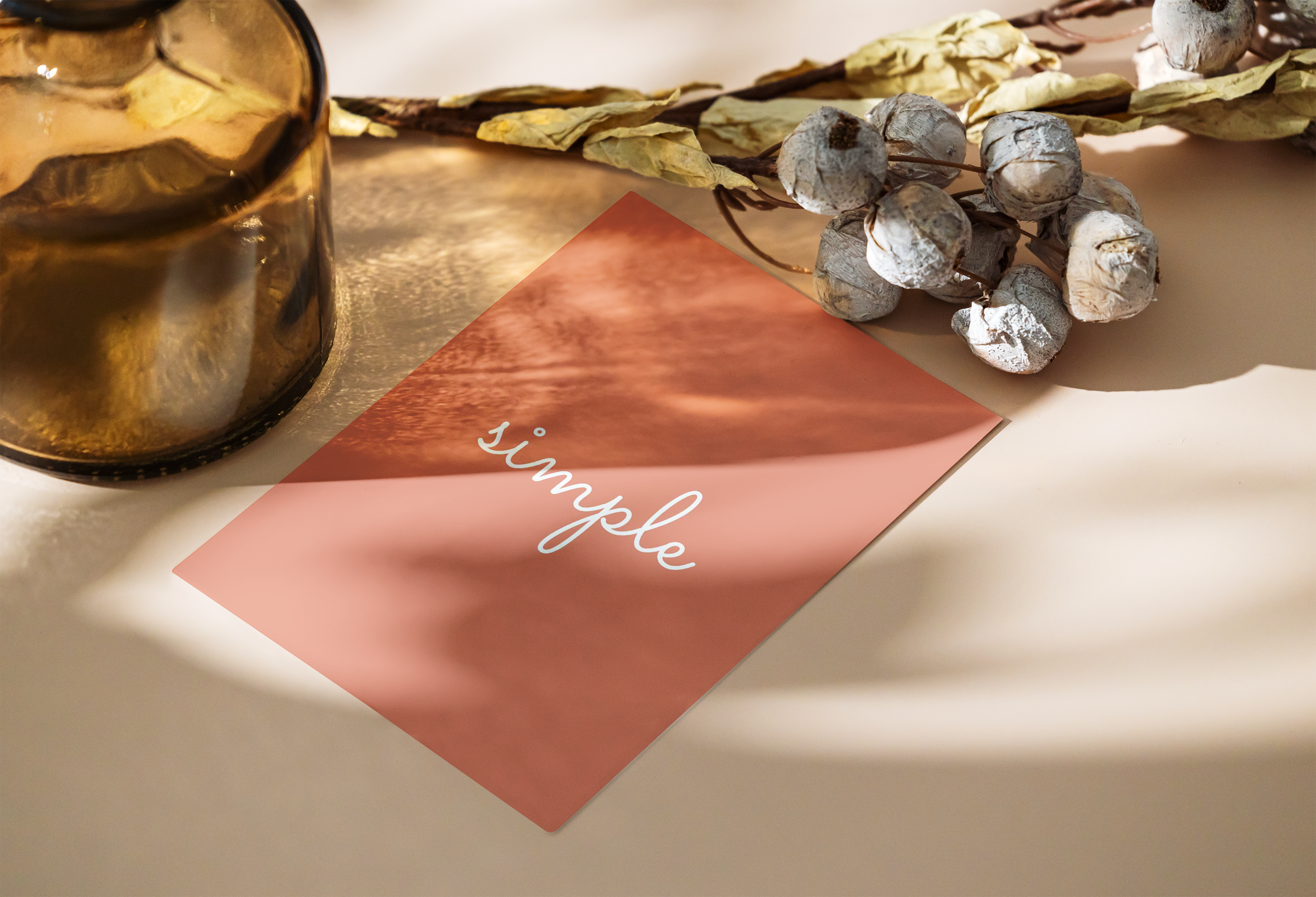 This mockup showcases a minimalist card set against a warm, earthy background. An amber glass bottle and decorative dried flowers are placed nearby, enhancing the natural aesthetic. The card itself is simple, featuring a clean design and a cursive word in the middle. Ideal for presenting your brand or creative ideas, this mockup can elevate your advertising efforts. Use our mockup generator to create stunning designs and share them on social media to captivate your audience. Start creating today!