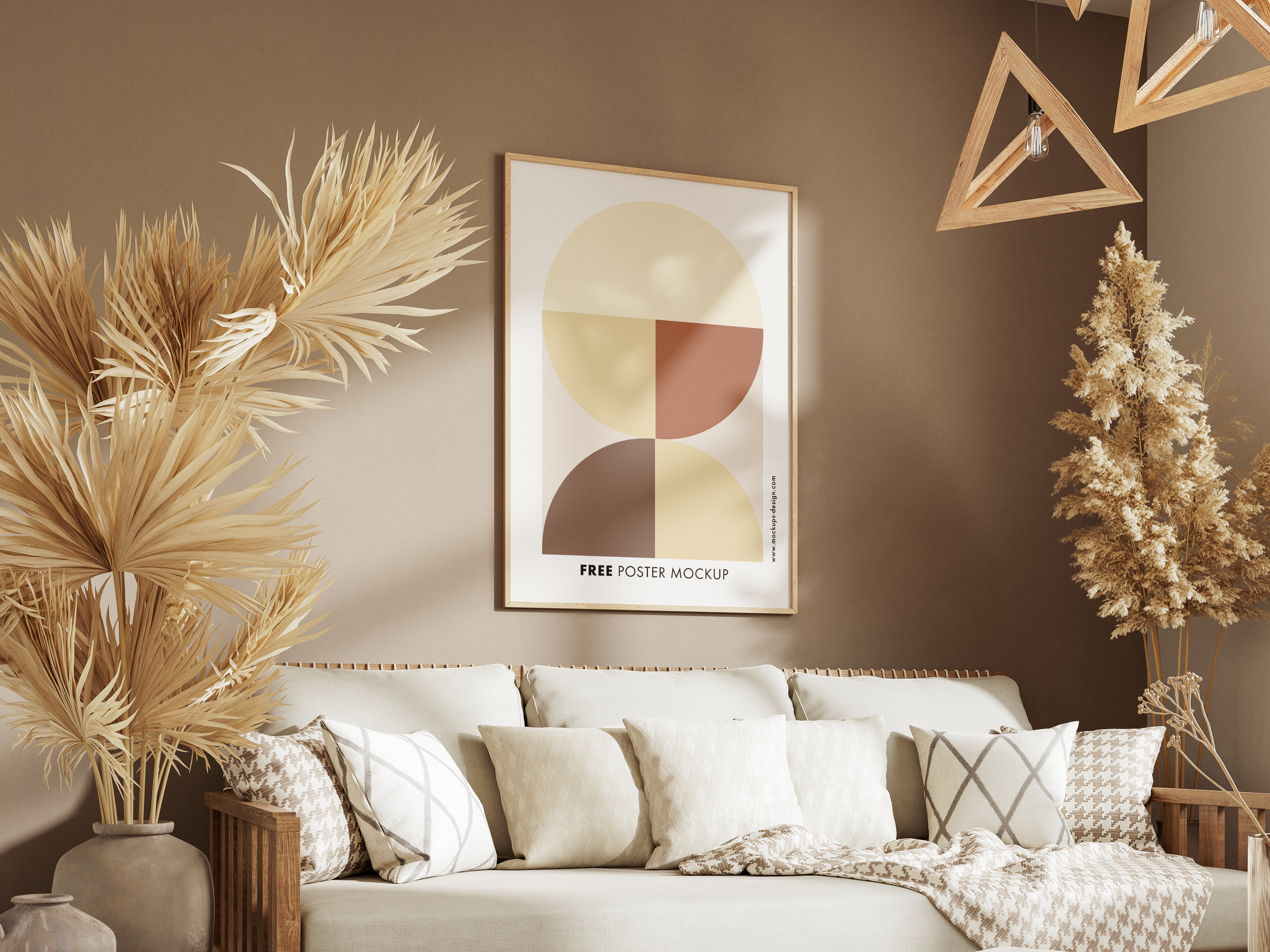 The mockup features a cozy, modern living room with earthy tones and a minimalist design. The background includes beige walls, geometric wooden light fixtures, and dried floral arrangements. The main object is a framed poster above a cream-colored sofa adorned with accent pillows. The poster includes abstract art with circular and semicircular shapes in muted pastel shades. Ideal for showcasing your artwork or advertisements, use this mockup generator to create stunning visuals and share your design on social media for maximum impact!