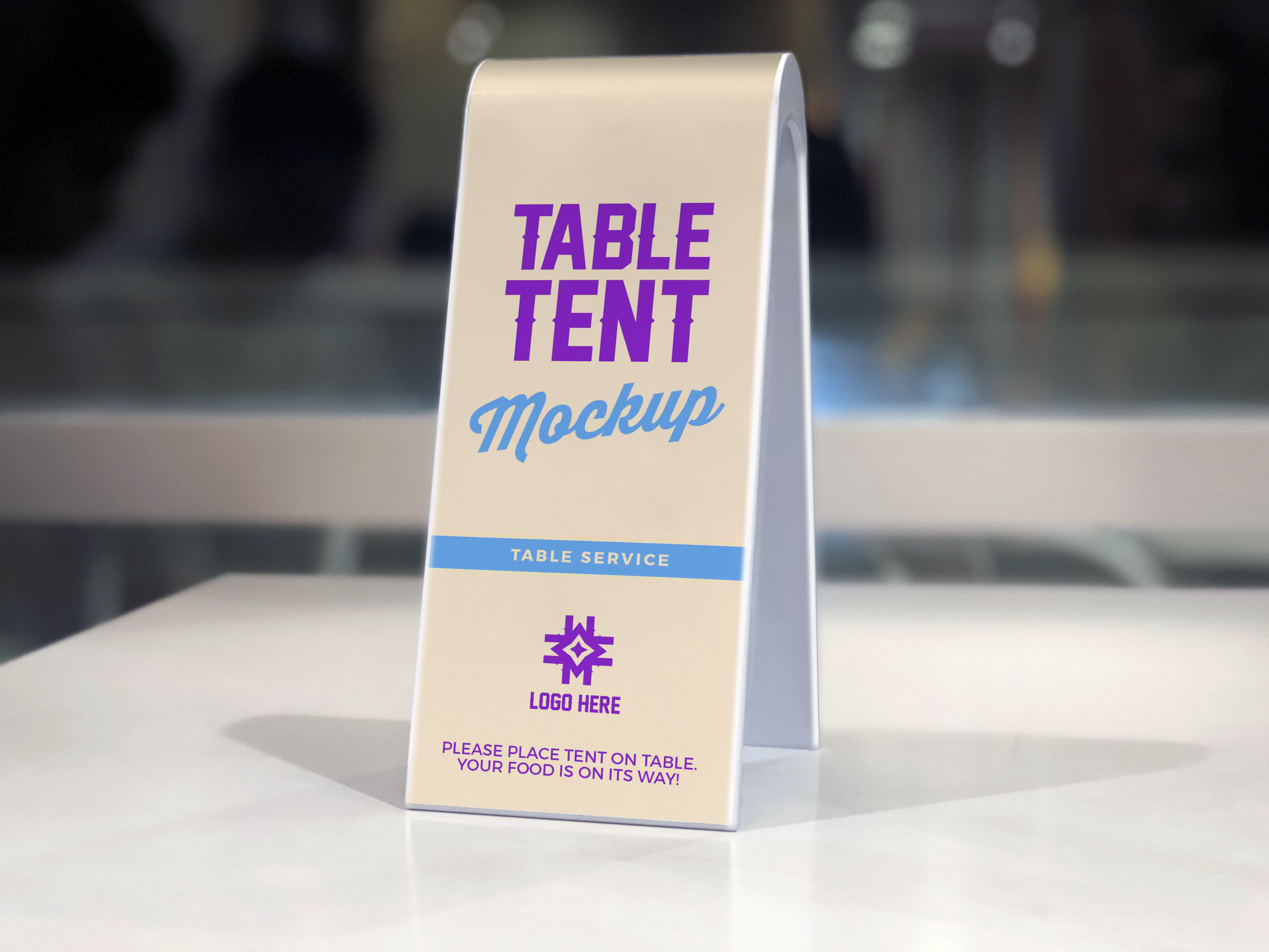 The mockup image showcases a table tent standing on a sleek, white surface within a modern setting, with a blurred background that suggests a busy indoor environment. The table tent is primarily beige, featuring bold purple and blue text and design elements such as a logo placeholder. Use this mockup for effective advertising in restaurants or events by highlighting your key messages or promotions. Get creative with the mockup generator and share your unique designs on social media today!