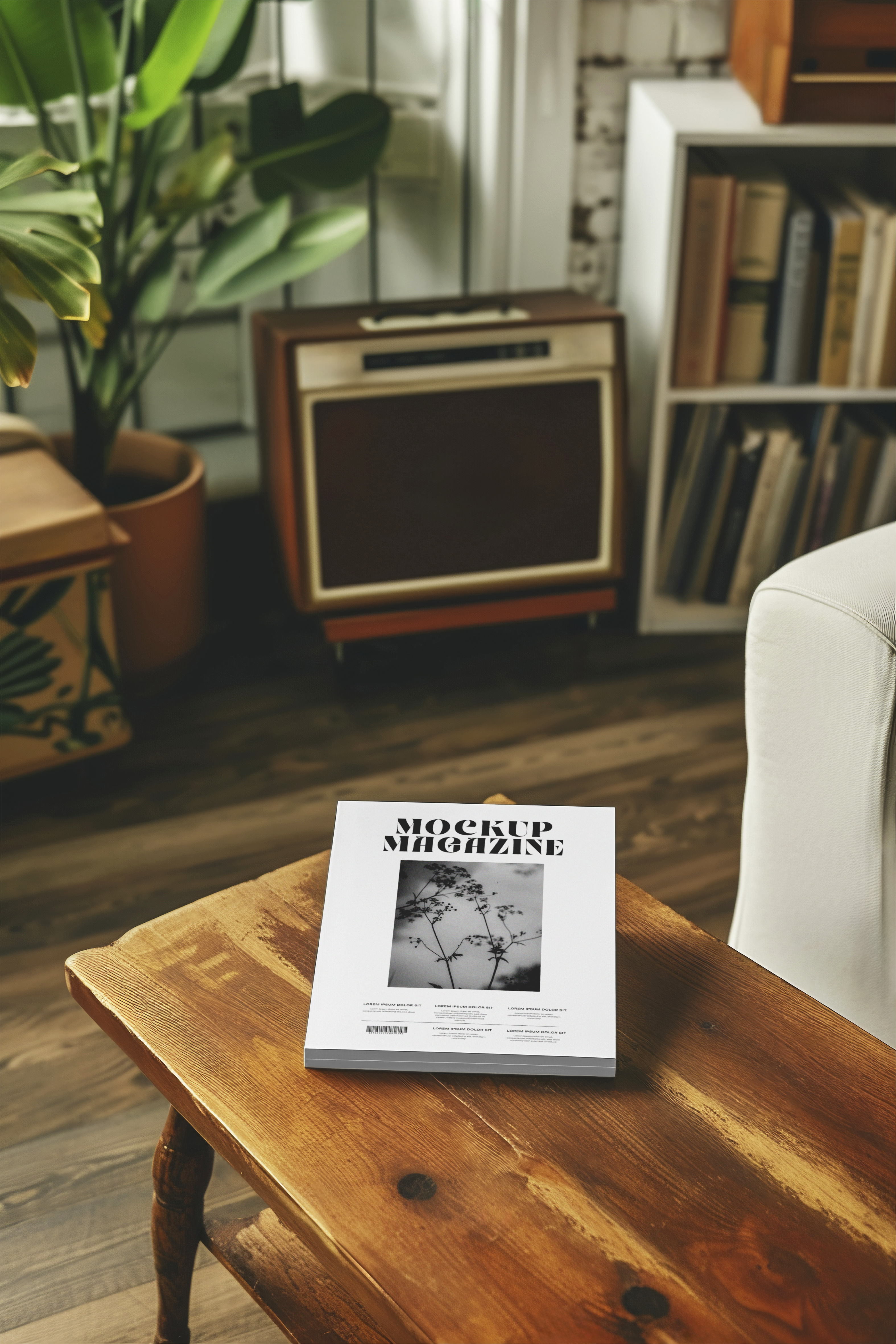 The mockup image features a modern, cozy room with wooden flooring, houseplants, a retro radio, and a bookshelf filled with books. The main object is a magazine placed on a rustic wooden coffee table. The magazine cover has a minimalist design featuring monochrome photography, white background, and clean typography. Use this mockup to showcase your upcoming magazine issue in a stylish, homey setting. Try our mockup generator today and share your unique design on social media!