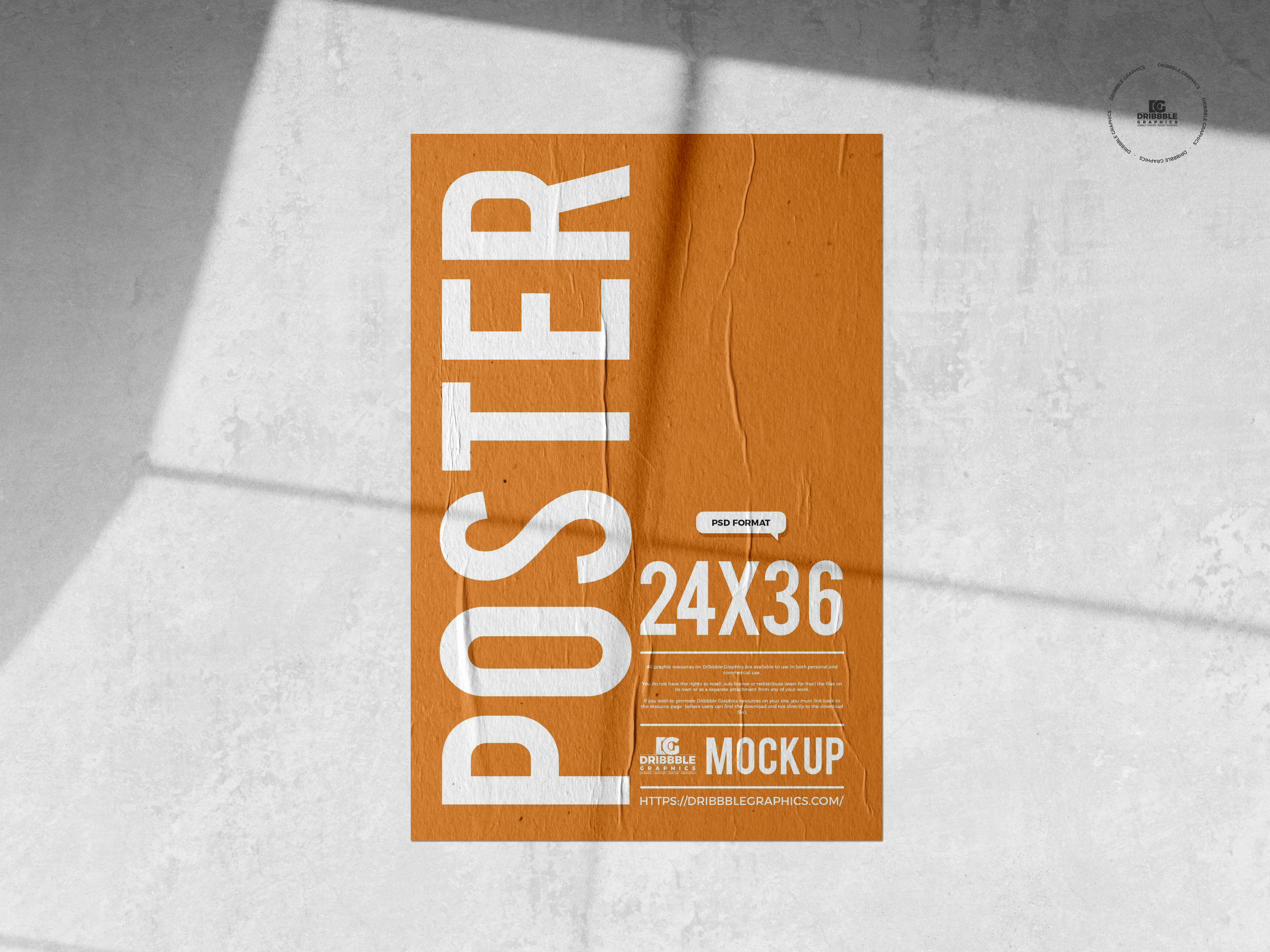 A template of an orange poster labeled "24x36" displayed on a concrete floor with distinct shadows cast over it.