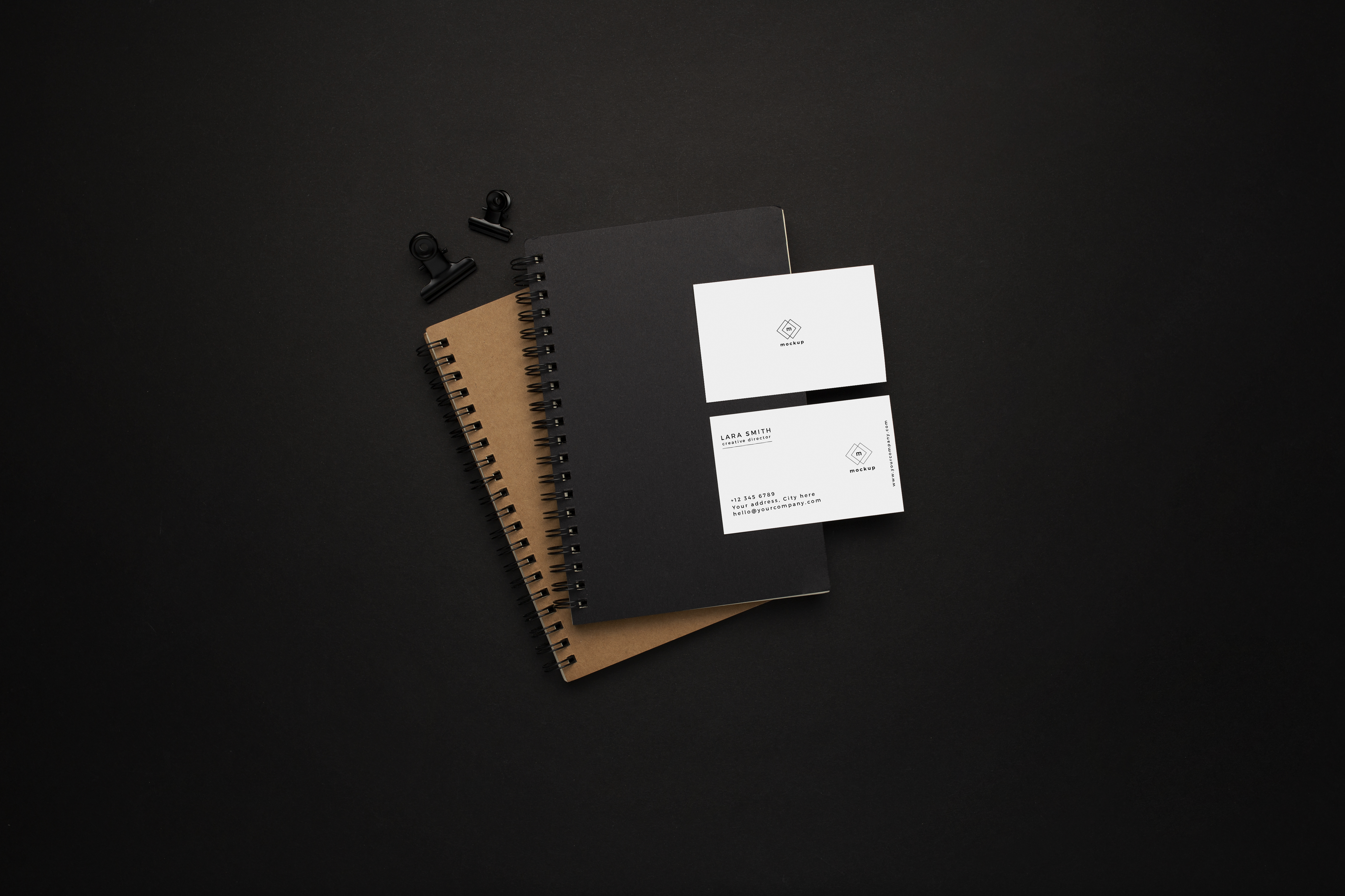The mockup image displays a professional setting with a sleek black background. The main objects include two spiral-bound notebooks, one black and one brown, accompanied by two business cards placed on top. The image also features a couple of black binder clips. The clean and minimalist design is perfect for advertising office supplies or stationery. Use this mockup generator to create stunning, professional designs and share them on social media to enhance your brand presence!