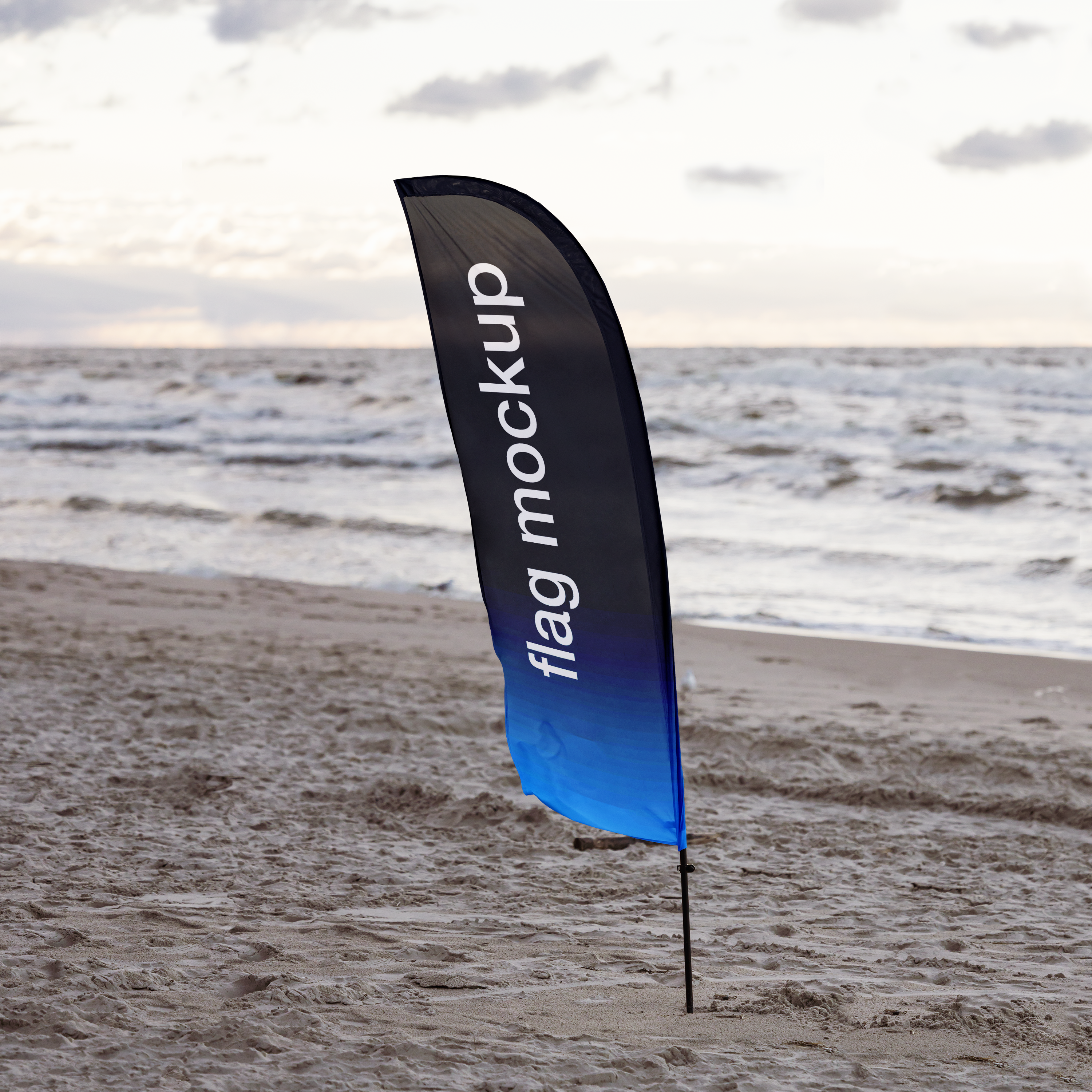 The image showcases a flag mockup placed on a sandy beach near the ocean, with the sea waves and cloudy sky in the background. The flag features a gradient design, transitioning from dark at the top to a bright blue at the bottom. This mockup is perfect for advertising outdoor events, beachside promotions, or nautical-themed businesses. Use this mockup generator to create your unique design and share it on social media to captivate your audience and boost engagement.