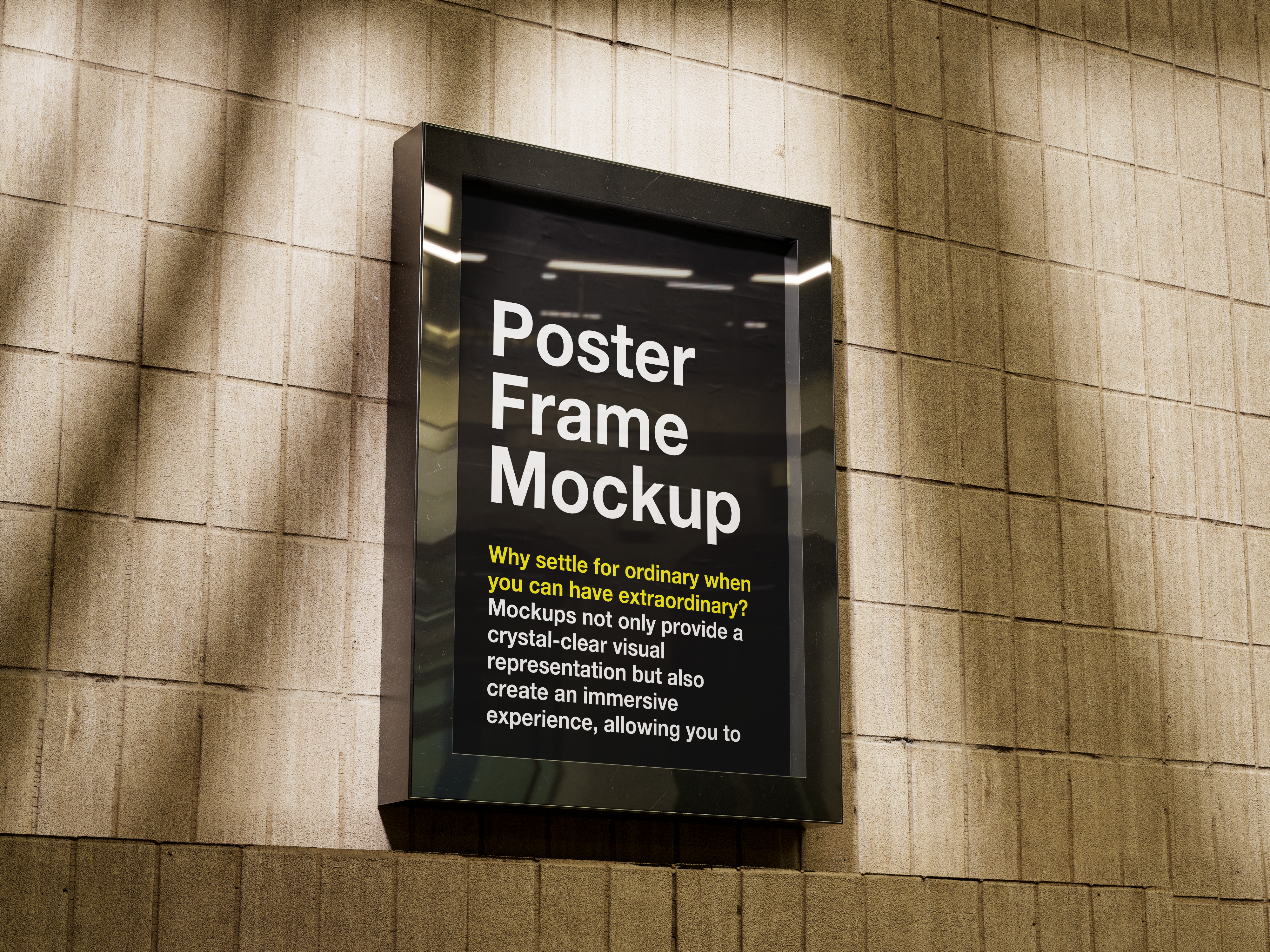 This mockup features a poster frame set against a tiled, beige wall, likely in a public or commercial indoor setting. The frame contains a clear, sleek glass surface, highlighting the content within. The lighting creates gentle shadows, adding depth to the presentation. Use this for visually appealing advertisements, making your messages stand out with high clarity and professionalism. Try our mockup generator to create stunning designs and share your masterpiece on social media now!