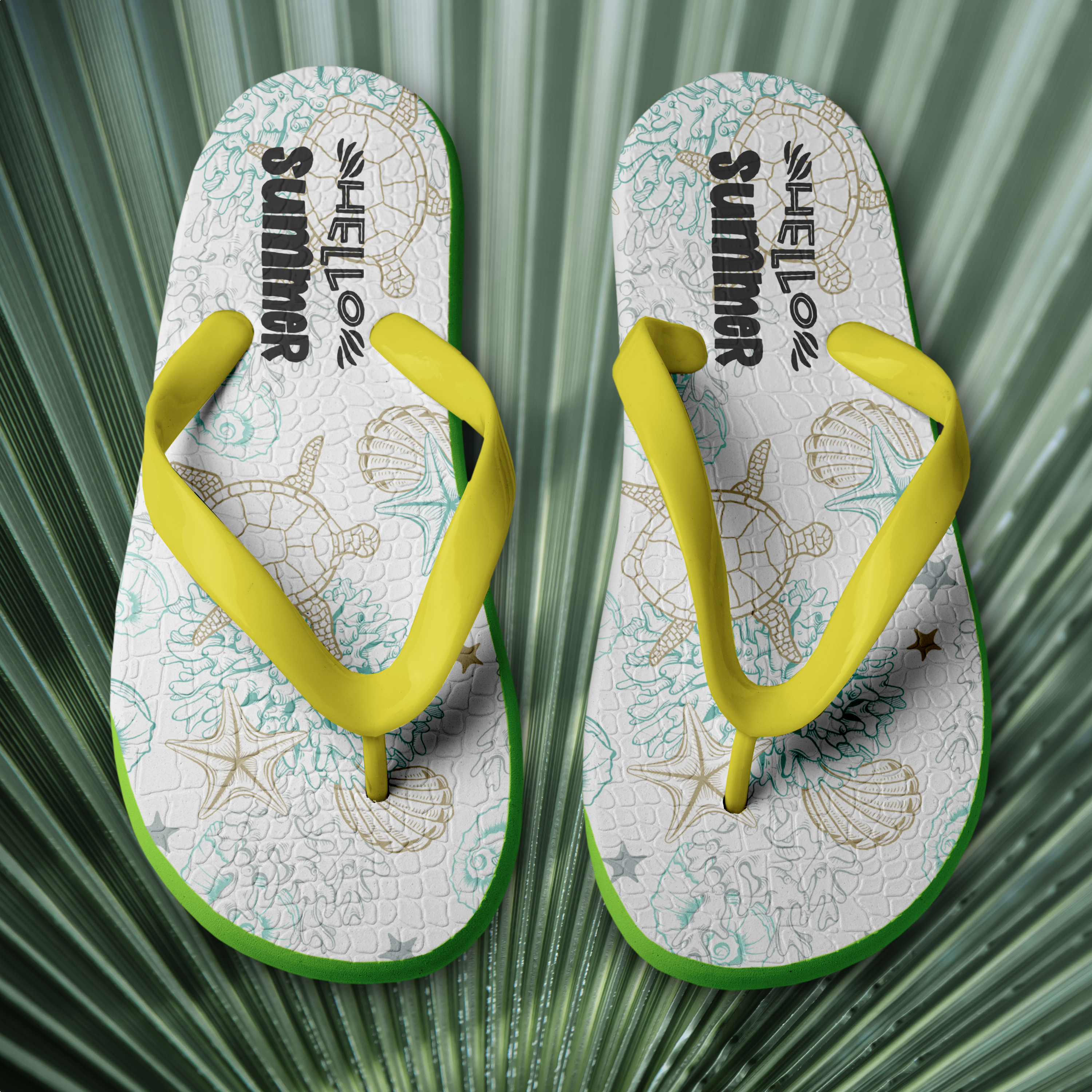 The mockup image features a pair of colorful flip-flops set against a backdrop of vibrant green leaves. The flip-flops have a white base with intricate designs, including turtles, starfish, and seashells. Bright yellow straps add a pop of color. This mockup is perfect for advertising summer footwear collections. Showcase your unique designs with this generator and boost your summer campaign. Use this tool to create your mockup and share your design on social media to attract customers!