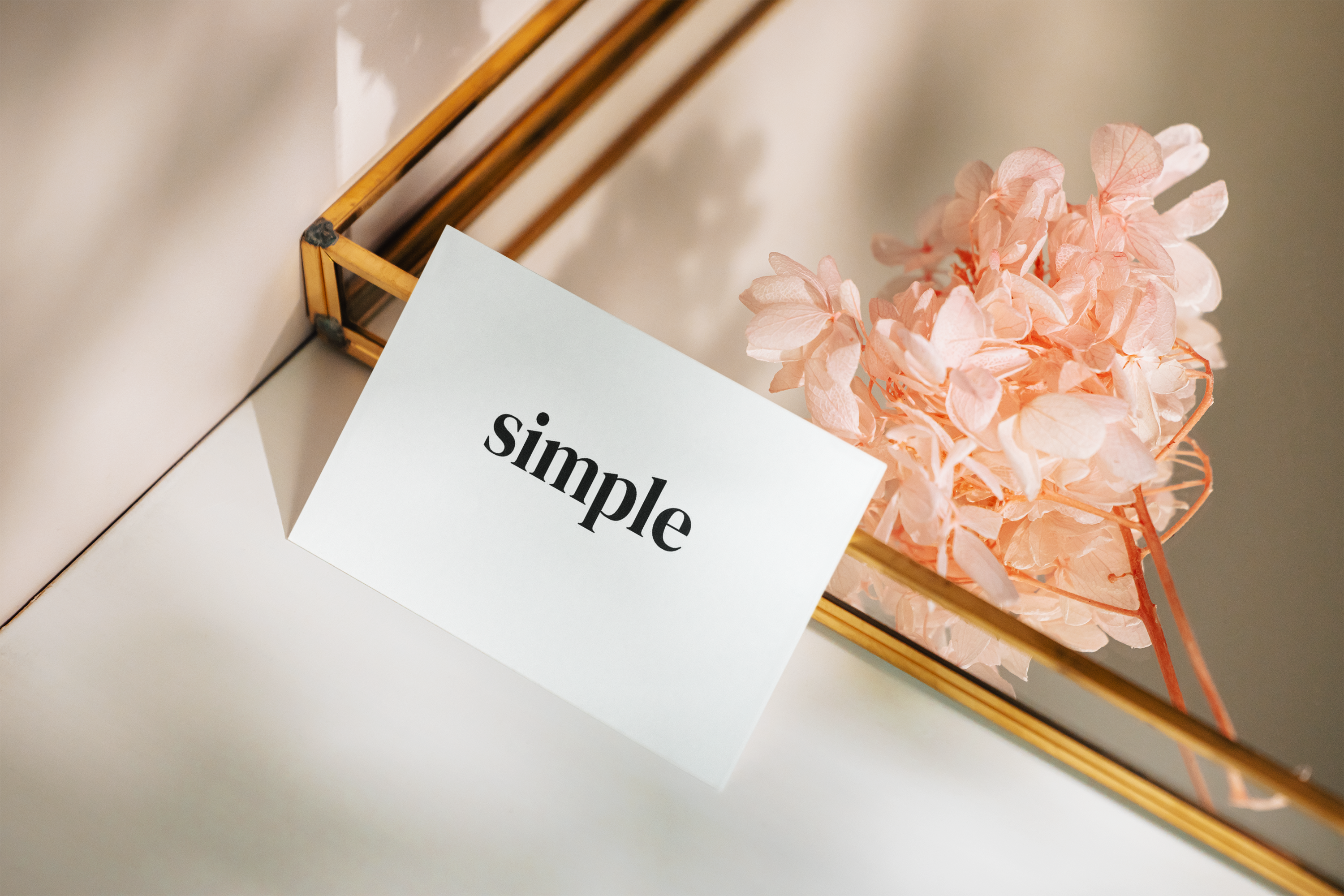 A white card template with the word "simple" printed on it, resting on a surface alongside a pink crystal and golden thin rods, with soft sunlight casting shadows.