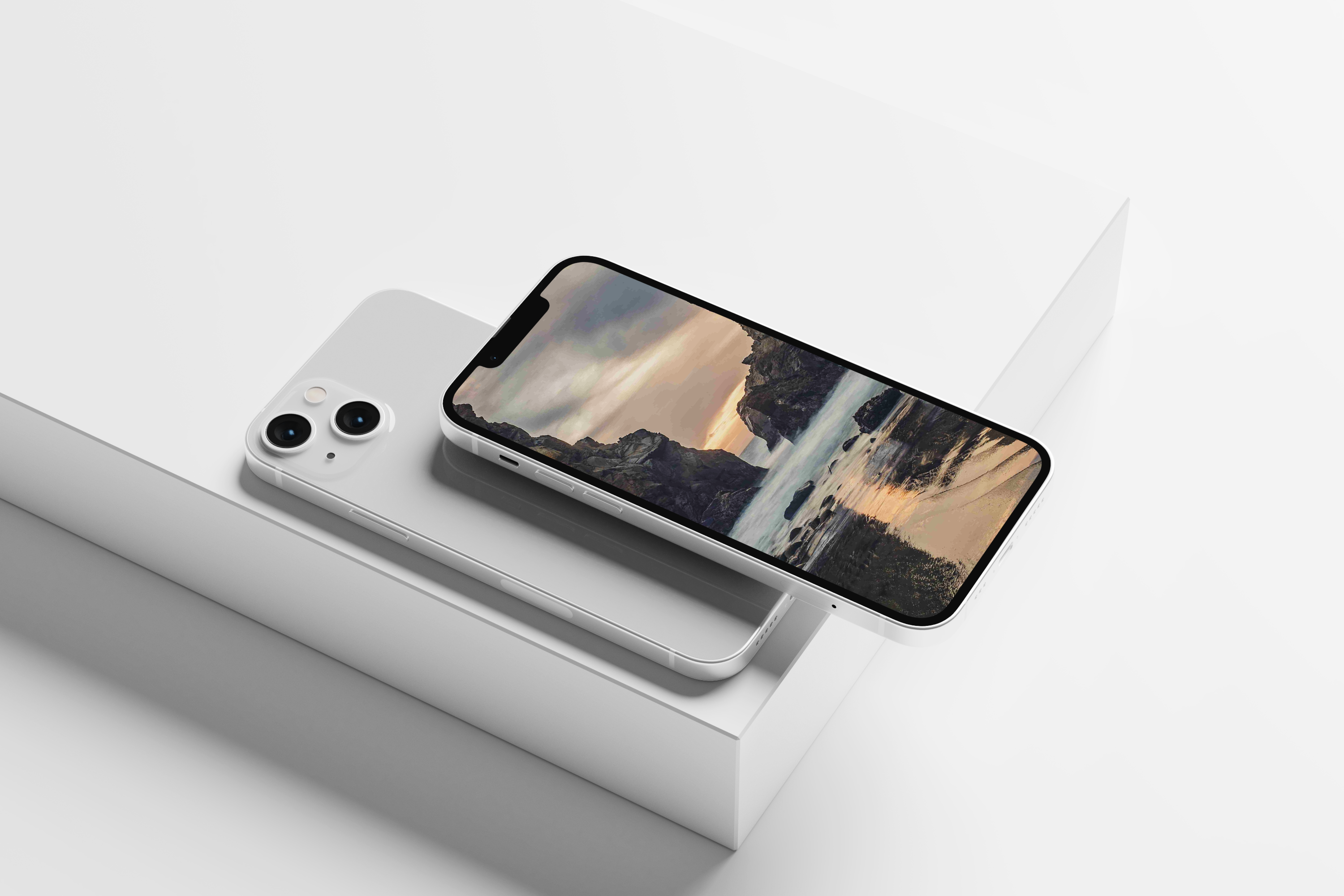 The mockup image features a sleek smartphone displayed in a minimalist white setting. The phone, with a modern design and dual camera setup, lies atop a white box, offering a clean and elegant aesthetic. The screen displays a vivid scenic image of a rocky coastline at sunset, showcasing the device's high-resolution display. This mockup is ideal for advertising tech products, app interfaces, or digital artwork. Use our mockup generator to create stunning visuals and share your designs on social media today!