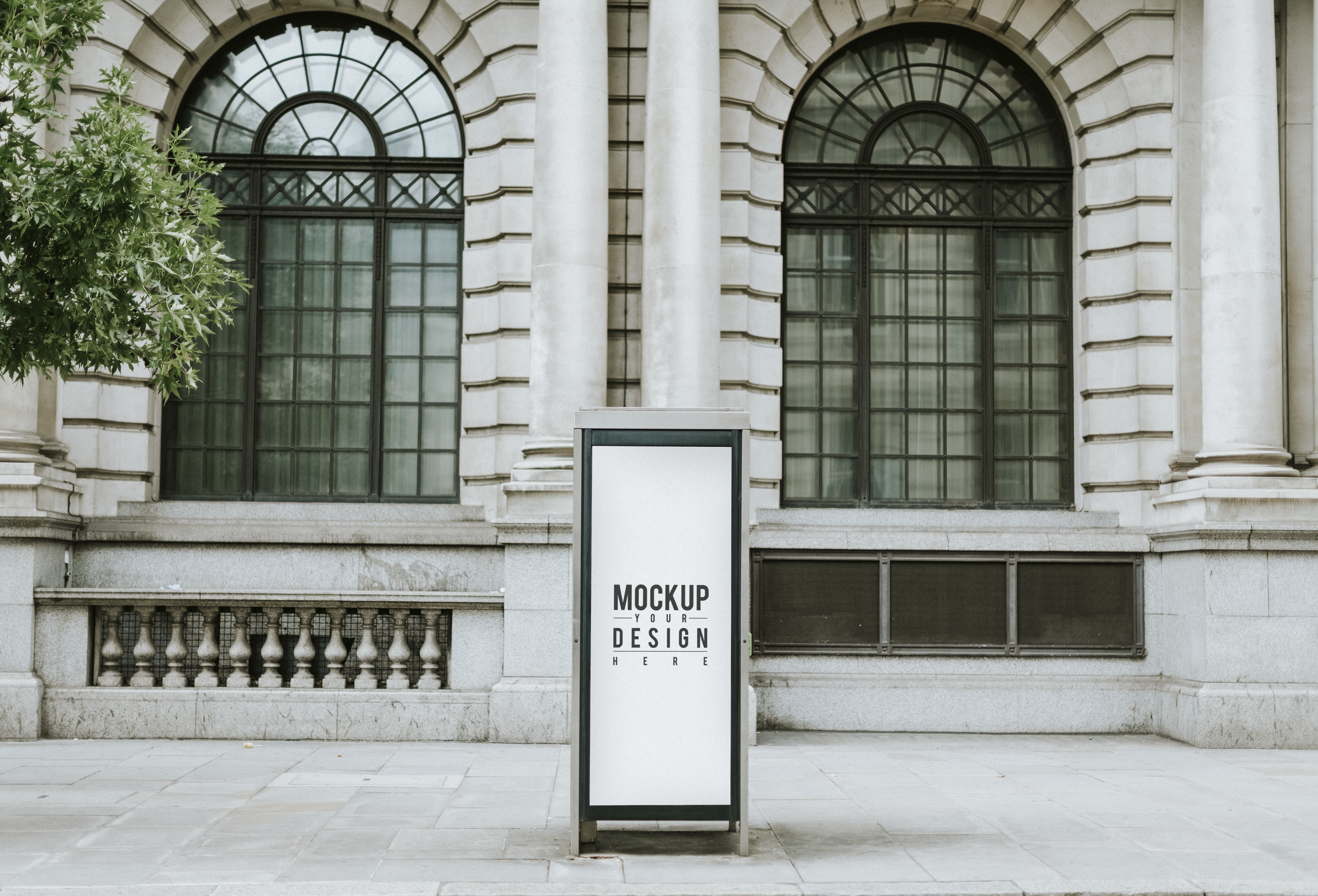 This mockup image features a modern advertising stand situated against a historic building backdrop with arched windows and columns, creating a striking blend of old and new. The main focus is a rectangular billboard with a clean, white design, perfect for showcasing a custom advertisement. You can use this realistic mockup to see how your content will look in a sophisticated urban environment. Try our mockup generator today and share your stunning design on social media!