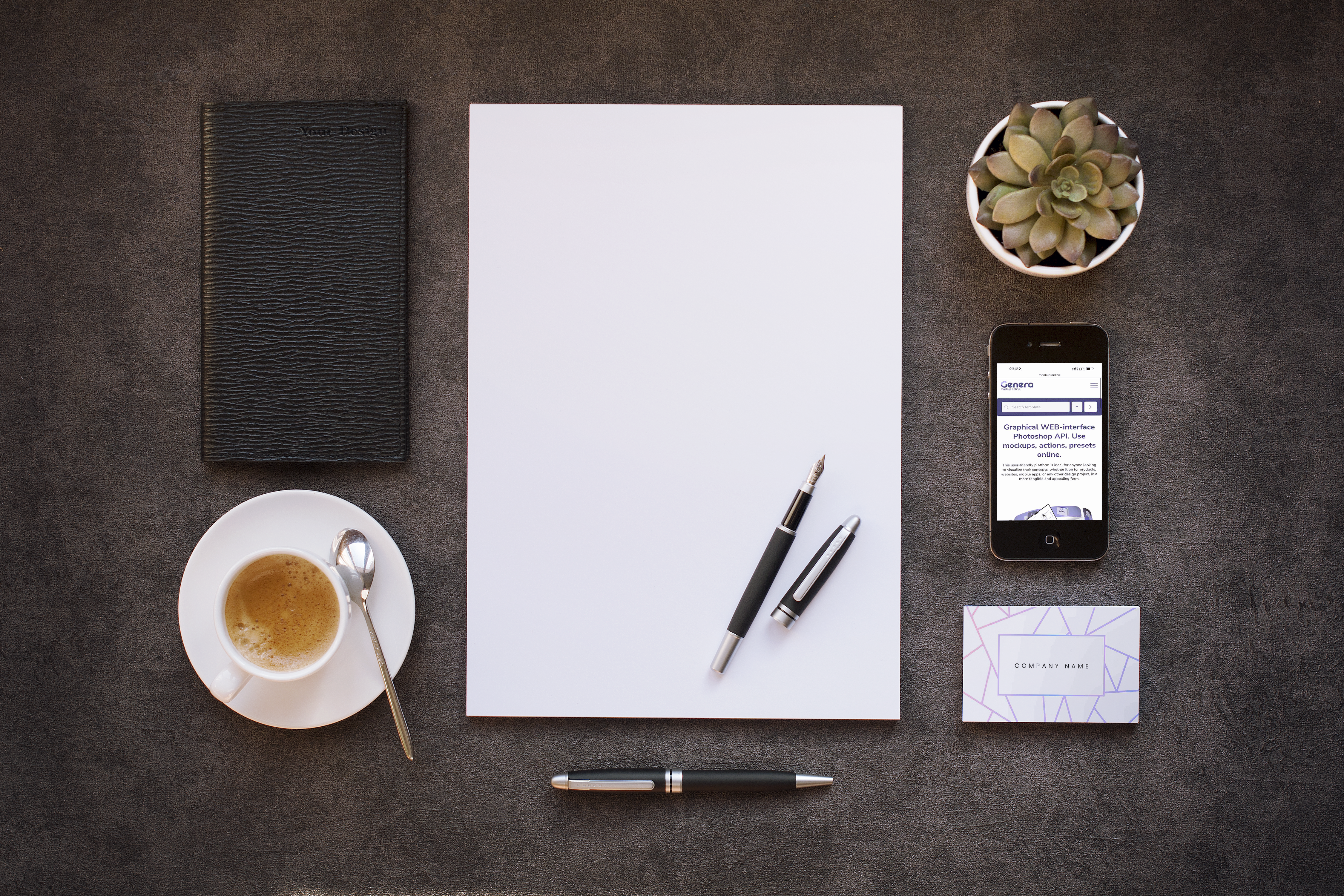 The mockup image features a dark textured desk with a clean, organized layout. The main object is a blank white sheet of paper in the center, accompanied by pens, a smartphone, a succulent plant, a notebook, a cup of espresso, and a business card. The minimalist, professional design makes it ideal for advertising stationery, branding, or digital app designs. Use this mockup generator to showcase your creativity and share your unique designs on social media!