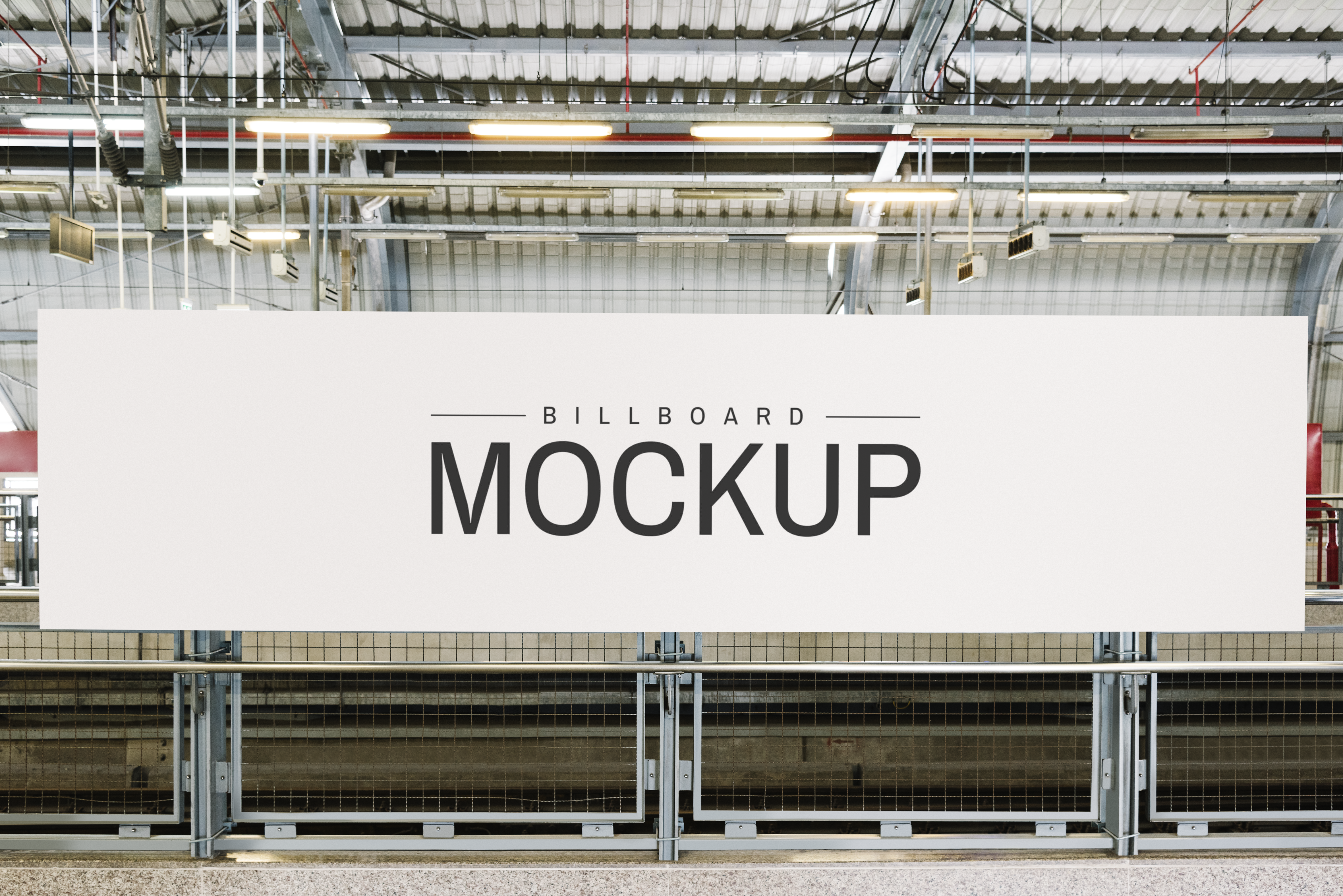 The mockup image showcases a large billboard set in a modern, industrial train station. The background reveals a high, metal-plated ceiling with visible beams and various light fixtures, creating a sleek urban ambiance. The billboard is clean and white, providing a spacious area for impactful design elements. Ideal for advertising, this mockup helps you visualize marketing content in a real-world scenario. Use the mockup generator to create stunning designs and share your promotional material on social media for maximum exposure!