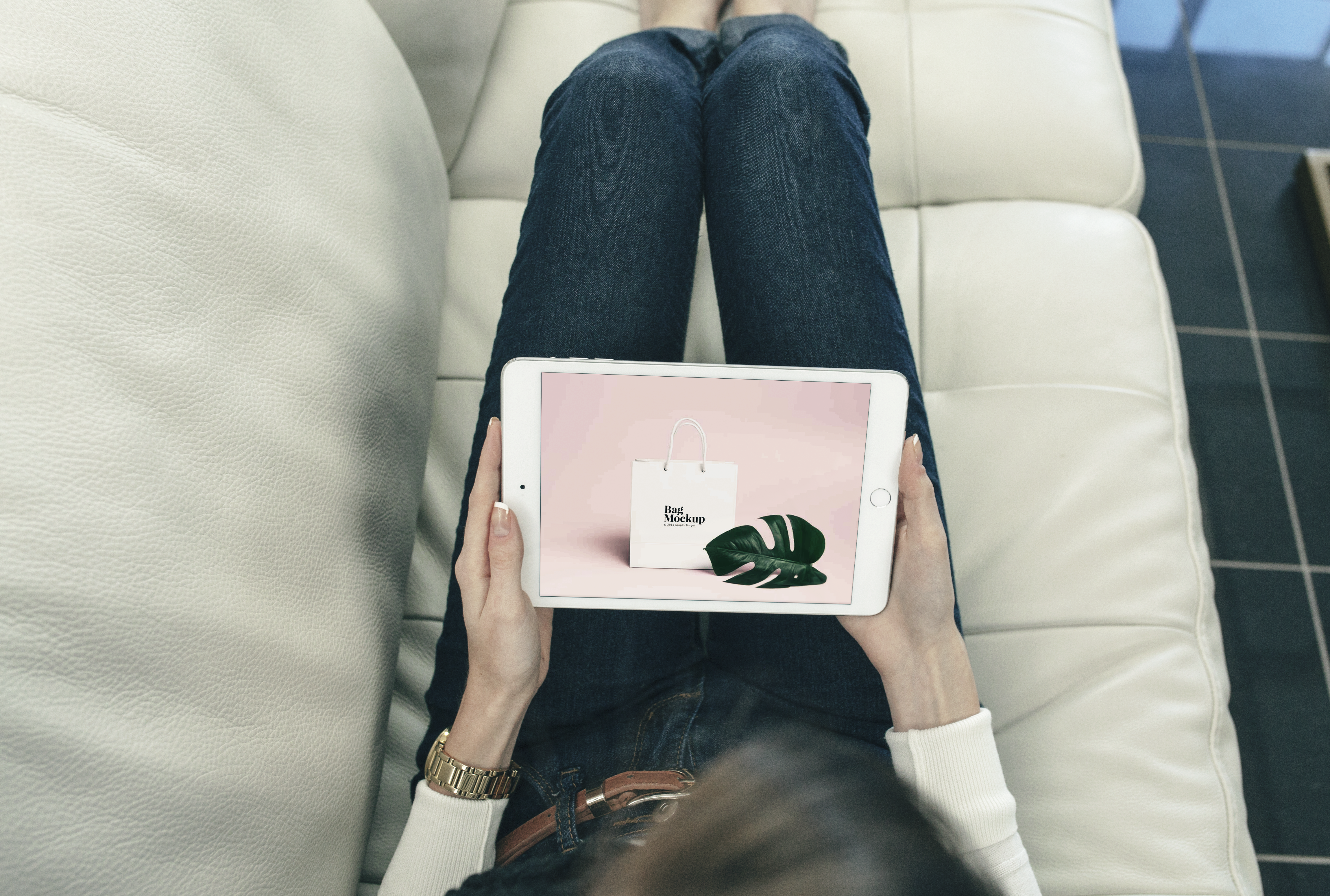 The mockup image features a person relaxing on a white leather couch with a modern tile floor in the background. They are holding a tablet displaying a minimalist design of a white shopping bag with green leaves against a pastel background. Utilize this mockup for advertising your e-commerce platform or retail store. Highlight your product designs in a realistic setting to attract more customers. Use our mockup generator and share your unique creations on social media now!
