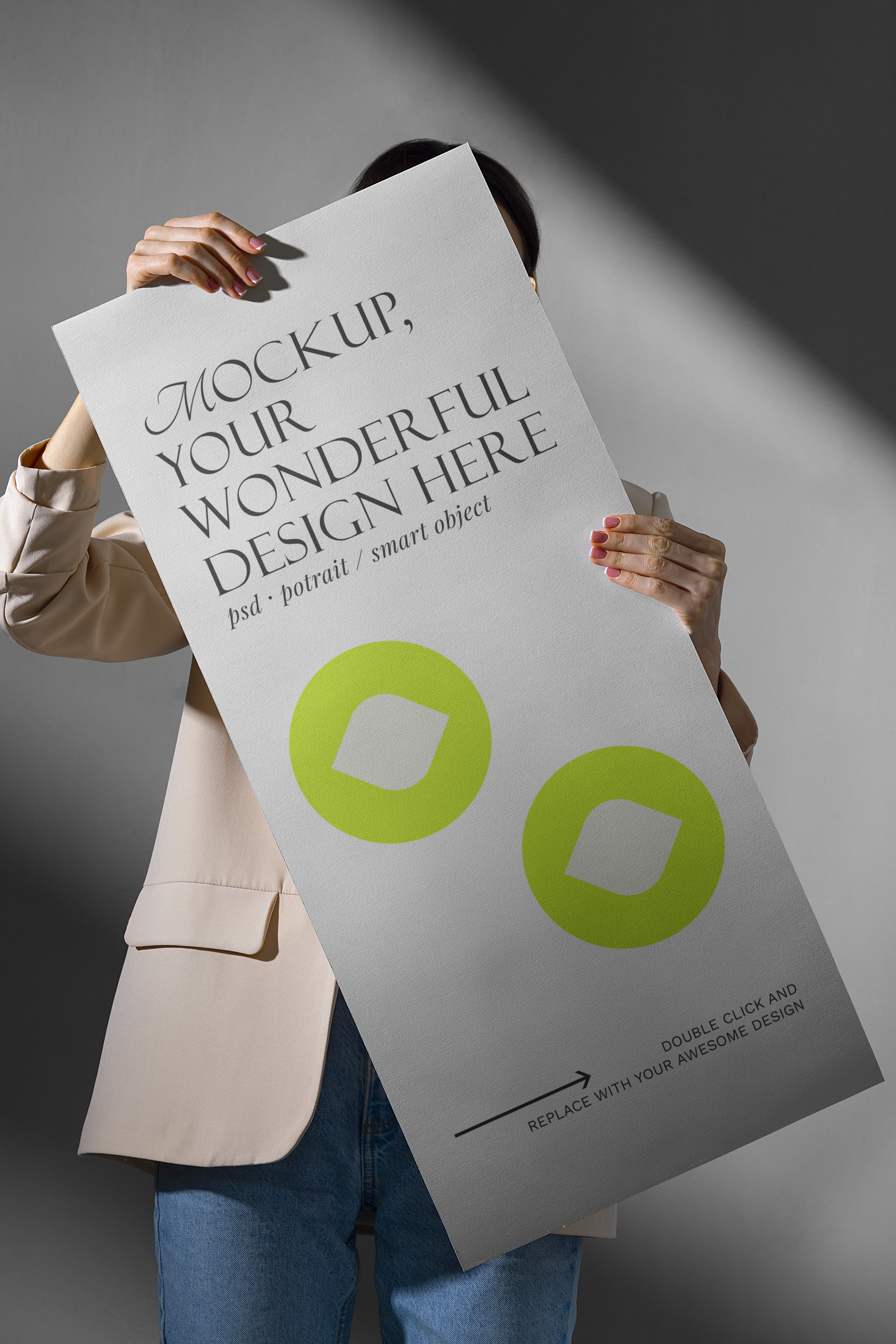 The mockup image features a person holding a vertical poster in a minimalist setting with a gray background. The poster displays placeholder text and two bright green circular design elements, creating a modern and clean aesthetic. This mockup can be effectively used for advertising by showcasing custom designs in a professional and appealing manner. Use the mockup generator to create your unique design and share it on social media to engage your audience and boost visibility!