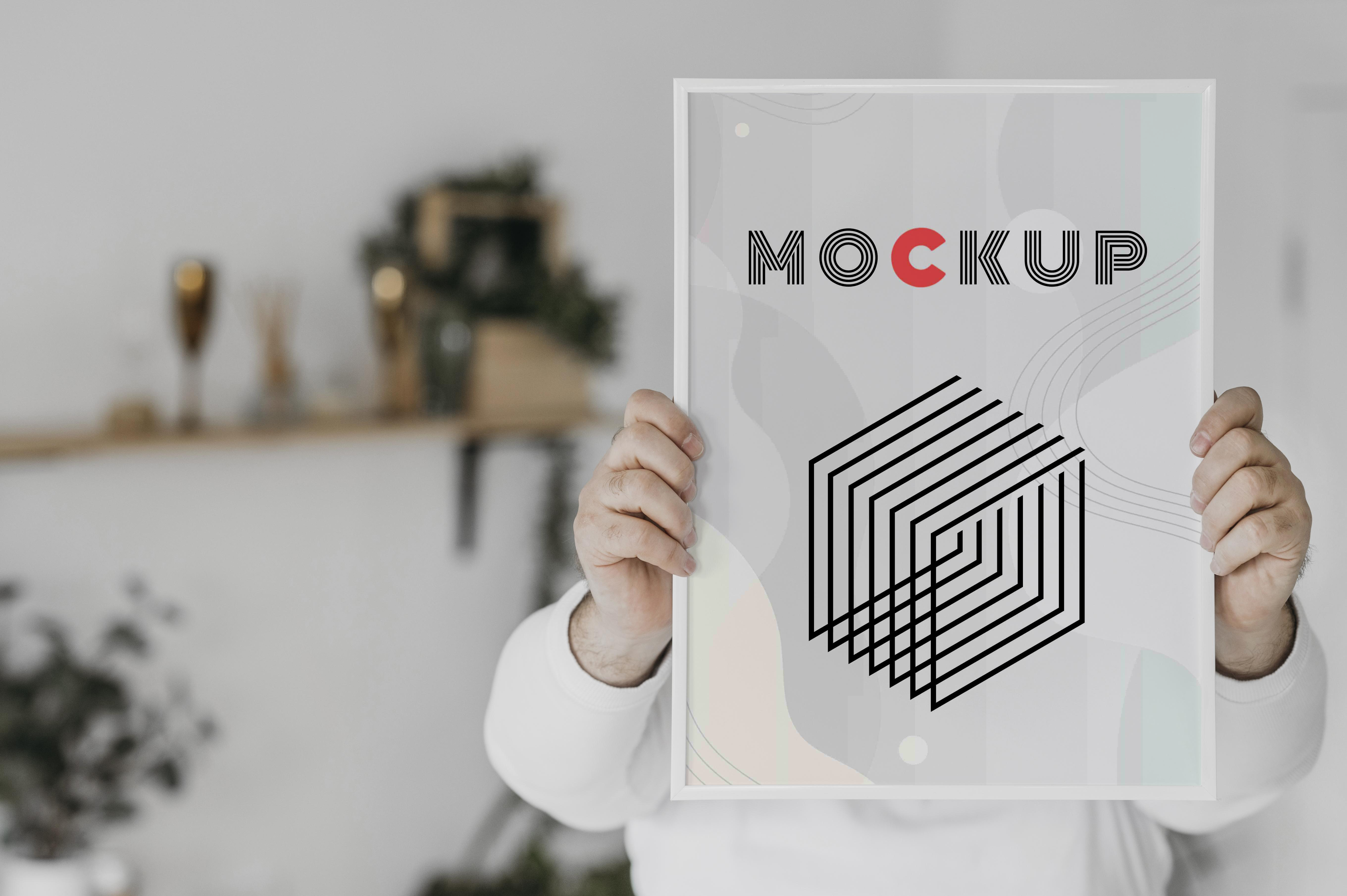The mockup image features a person holding a framed poster in a modern, cozy setting with a blurred background showcasing decorative items on a shelf. The poster displays a sleek, geometric design with overlapping lines creating a cube effect. This mockup is perfect for showcasing new design concepts or advertising art prints. Use the mockup generator to visualize your designs and share the stunning result on social media to attract attention and engage your audience. Start creating now!