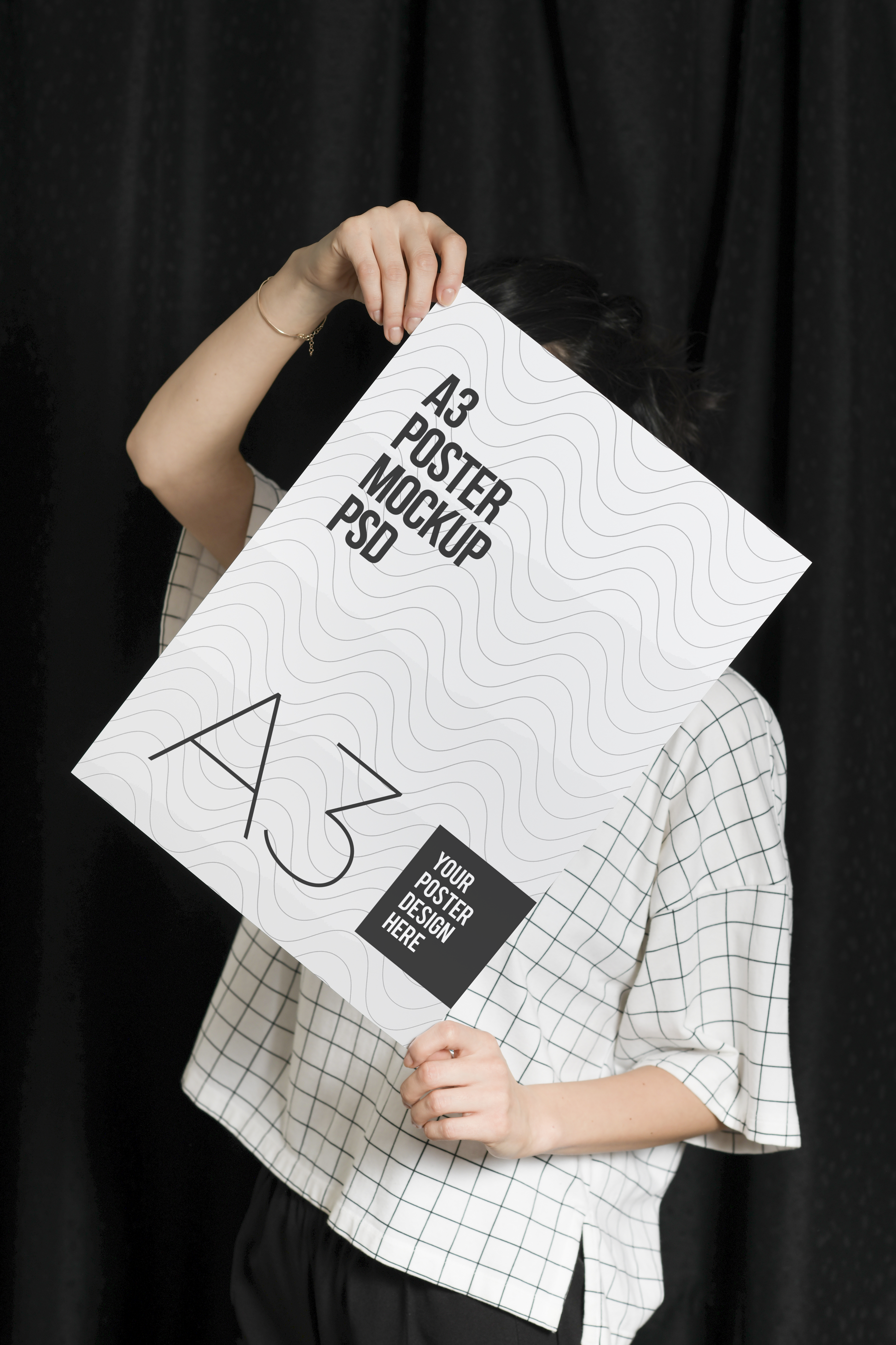This mockup image features a person holding an A3-sized poster against a plain dark curtain background. The poster has a minimalist design with wavy line patterns. The setting is simple and modern, allowing the poster to be the focal point. This mockup is excellent for showcasing your creative designs for advertisements, event promotions, or artistic displays. Use our mockup generator to create stunning poster designs and share your unique creations on social media for maximum impact and engagement!