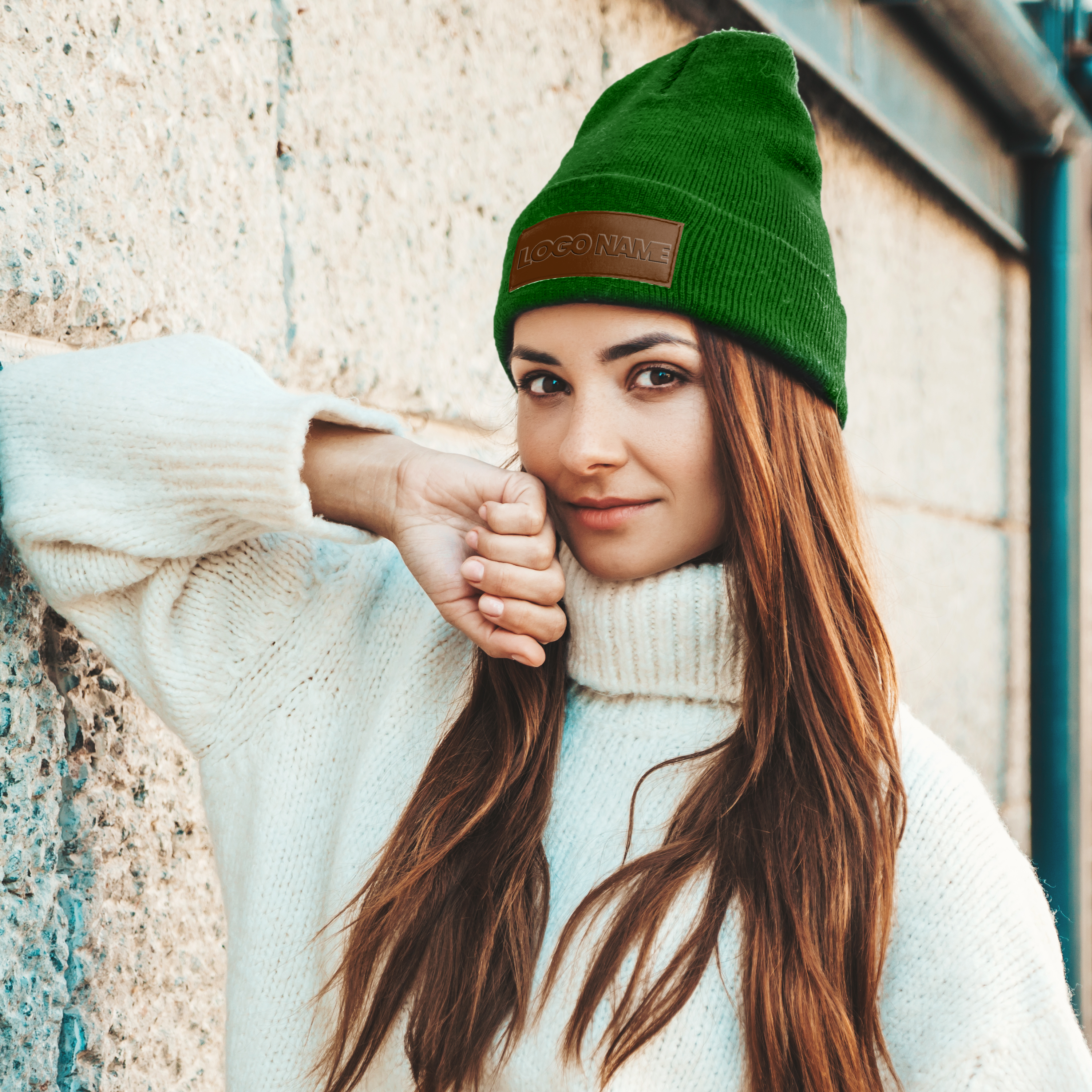 This mockup features a person wearing a green beanie with a leather patch, set against a textured stone wall in an outdoor urban environment. The beanie stands out with its vibrant color and prominent logo area on the front. Perfect for advertising fashion accessories, winter apparel, or creating custom merchandise. Use this mockup generator to showcase your design and make a statement. Share your personalized creation on social media to engage your audience and drive attention to your brand!