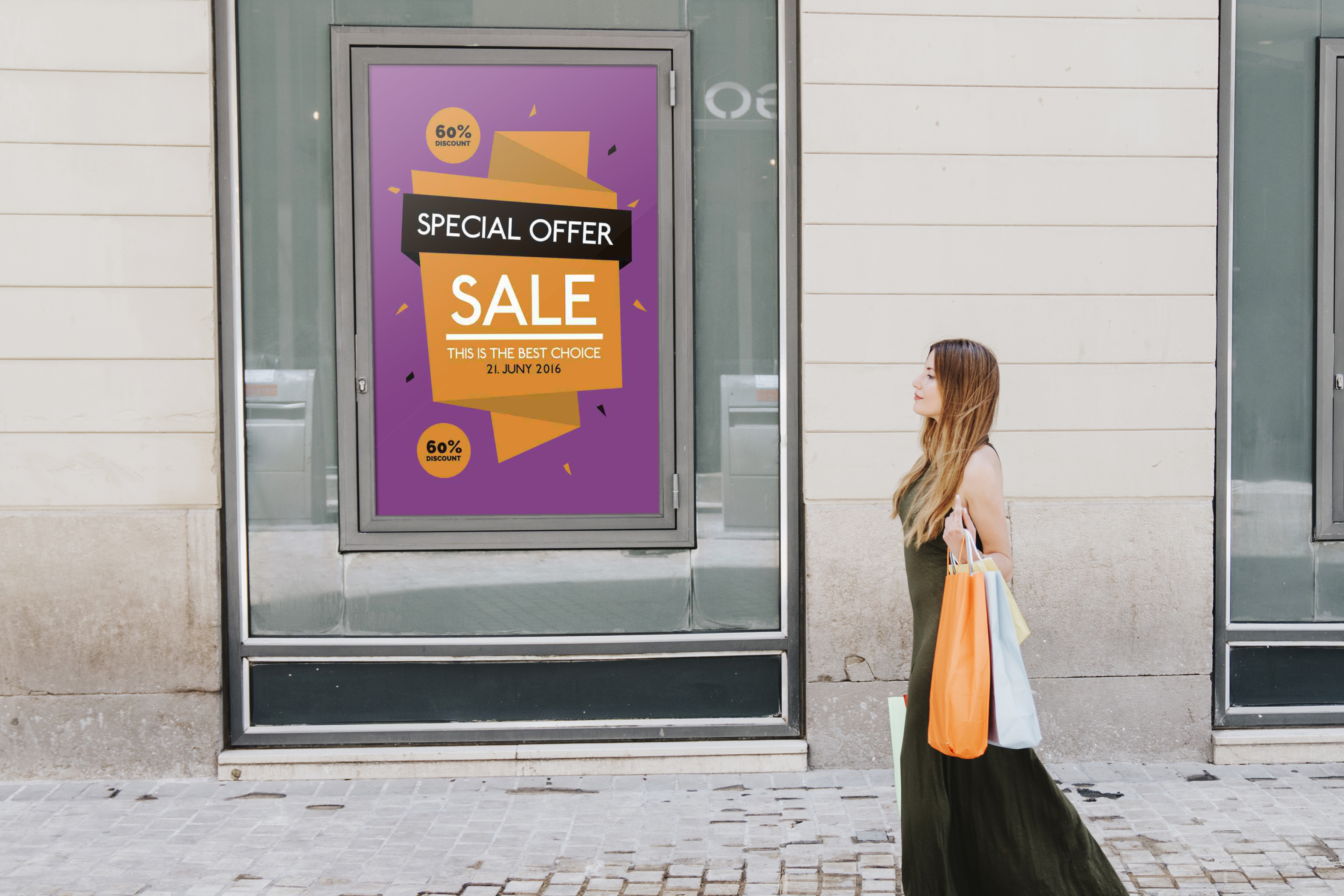 The mockup image depicts an urban street setting with a storefront display window featuring a large vertical sign. The background consists of neutral tones with stone tiles on the sidewalk. The main object of the mockup is a colorful poster with geometric elements, primarily in purple, orange, and black, promoting a sale. This poster design can be effectively used to advertise store promotions or special offers. Use our mockup generator to create your design and share it on social media to attract more customers!