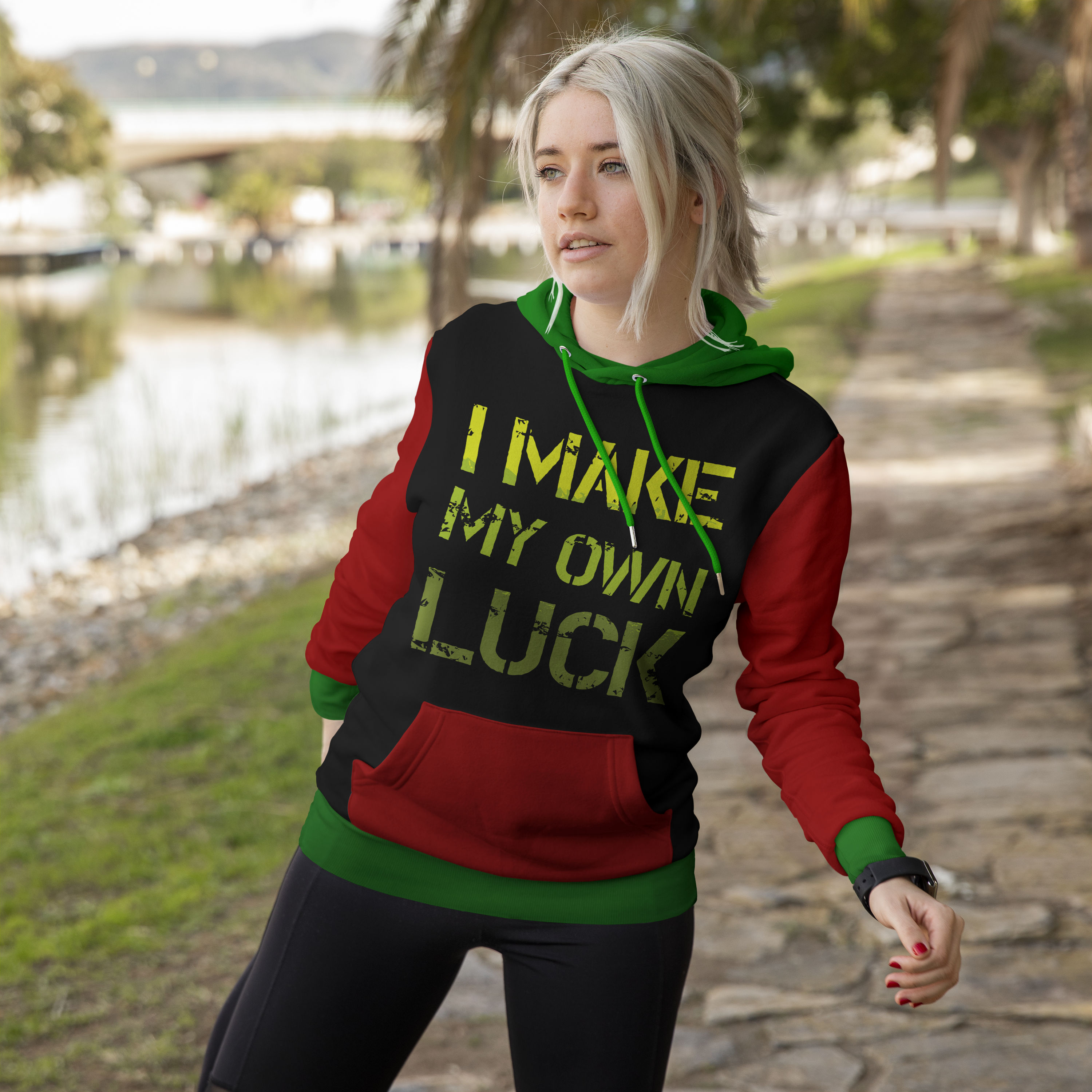A woman wearing a hoodie that says i make my own luck in the provided template.