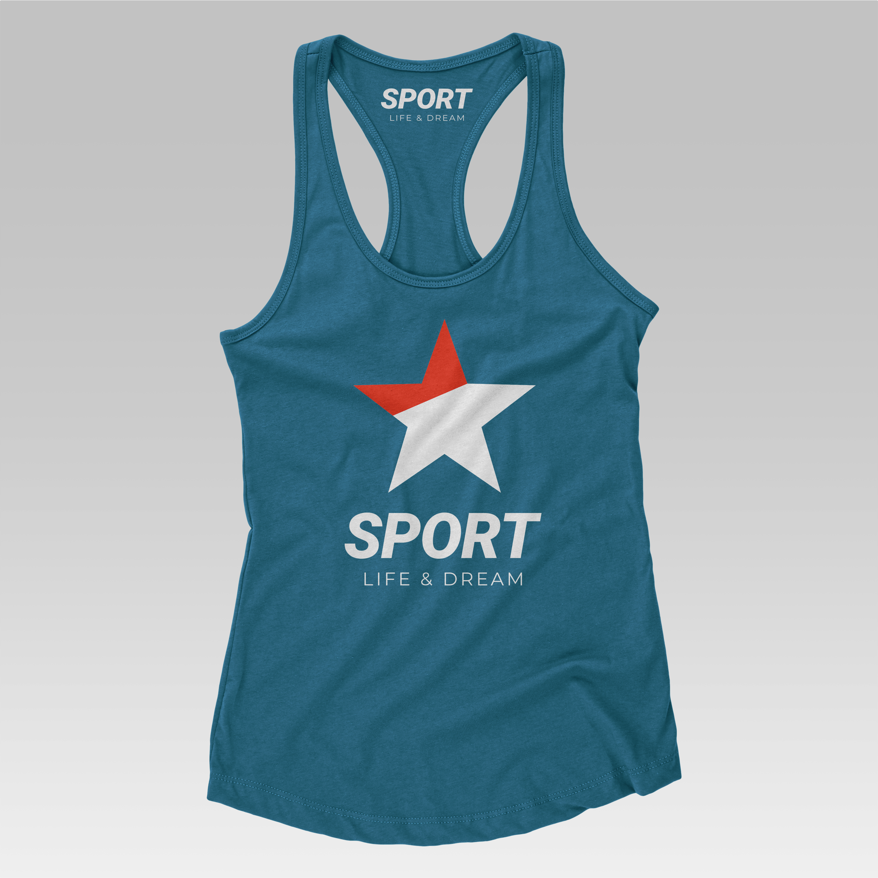 A women's racerback tank top with the word sport on it, perfect for creating a mockup.