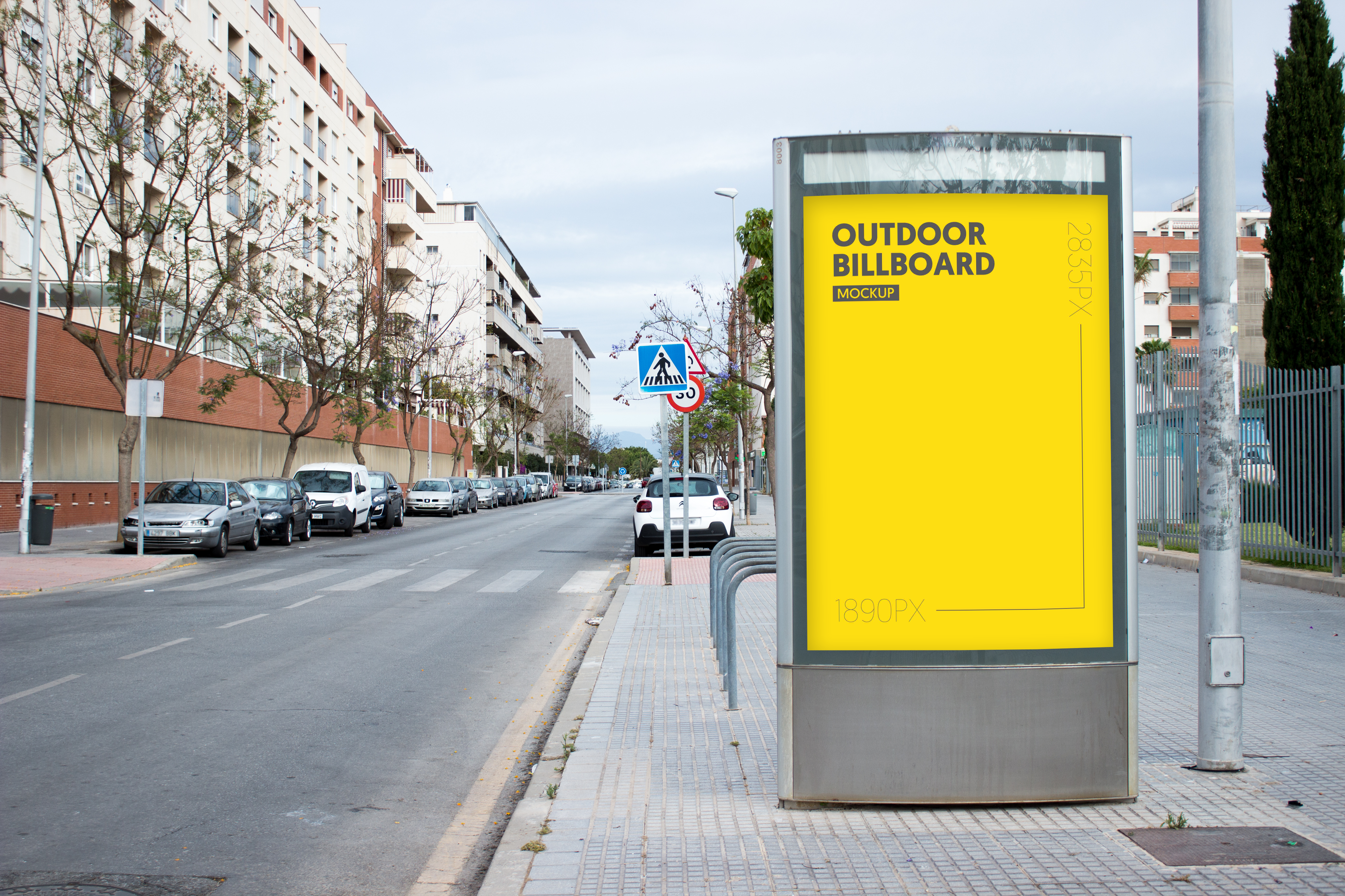 The mockup image features an outdoor billboard on a modern city street corner with a row of multi-story buildings, parked cars, and a pedestrian crossing in the background. The main object is a rectangular billboard with a clean, minimalist design. It features a vibrant yellow background and a grey frame. This mockup is perfect for advertising upcoming events, product launches, or special promotions in a high-traffic area. Use the mockup generator to create eye-catching designs and share them on social media to boost visibility!