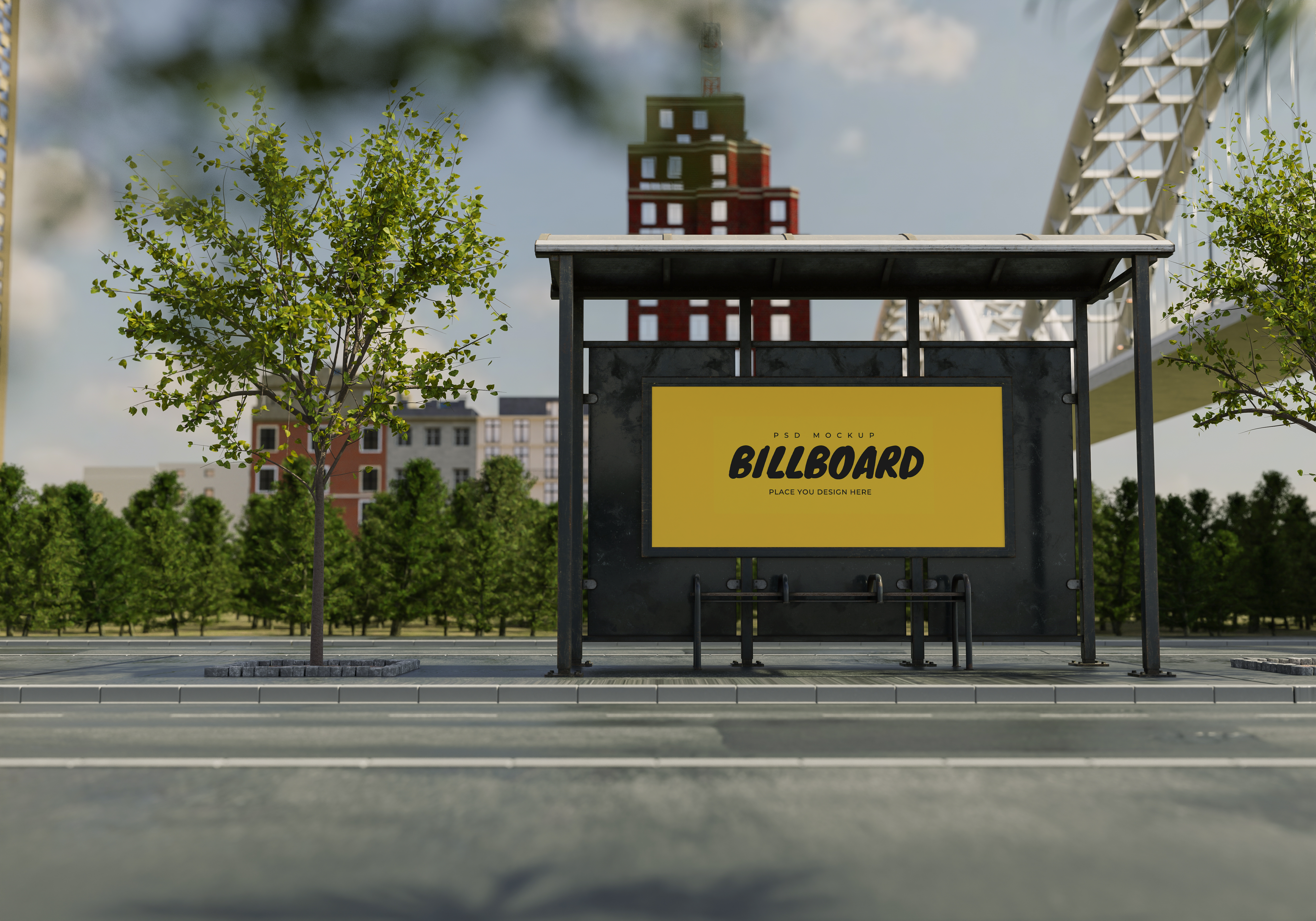 This mockup showcases a prominent billboard on a bus shelter along a tree-lined urban street. The background features tall buildings, greenery, and a large architectural structure, adding a cityscape vibe. The main billboard frame is in a straightforward setting, ready to display a vibrant design. Use this mockup to advertise events, brands, or promotions in a realistic downtown environment. Utilize our mockup generator now and share your stunning designs on social media for maximum impact!