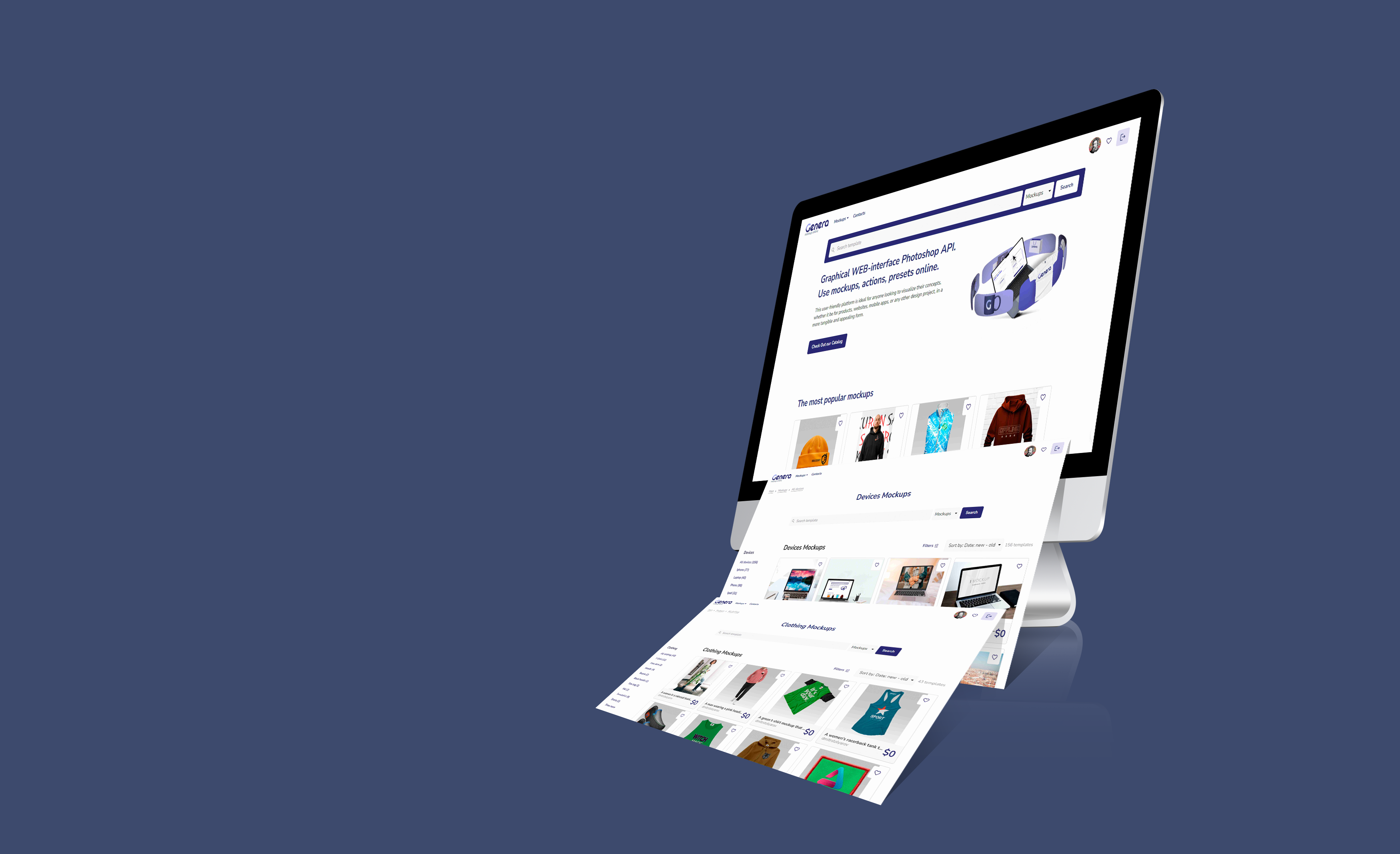 The mockup image features a sleek, modern desktop computer set against a solid, dark blue background. The screen displays a website homepage, cascading downward, showcasing various product thumbnails and interface areas, creating a flowing effect. This mockup is perfect for advertising website designs, online shops, or digital portfolios. Use our mockup generator to effortlessly create stunning visuals and share your custom designs on social media to boost engagement and visibility. Start designing now and make your online presence shine!