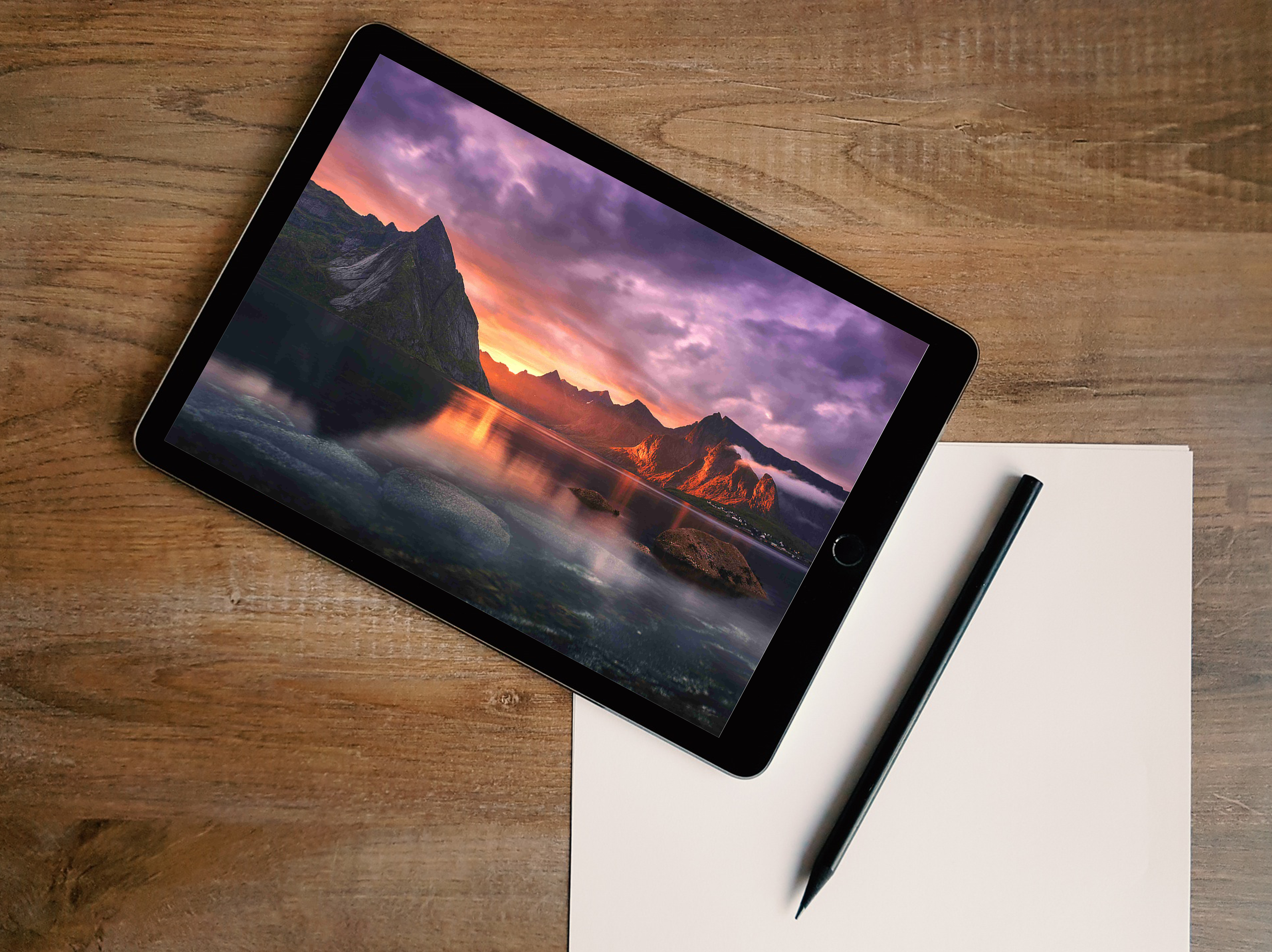 The main object, the tablet, displays a vivid and captivating landscape photograph. The image showcases a serene lake with rocky surroundings, reflecting the vibrant colors of a sunrise or sunset, with brilliant hues of purple, orange, and pink illuminating the sky and water. A silhouette of majestic mountains in the background adds depth and a sense of grandeur to the scene.