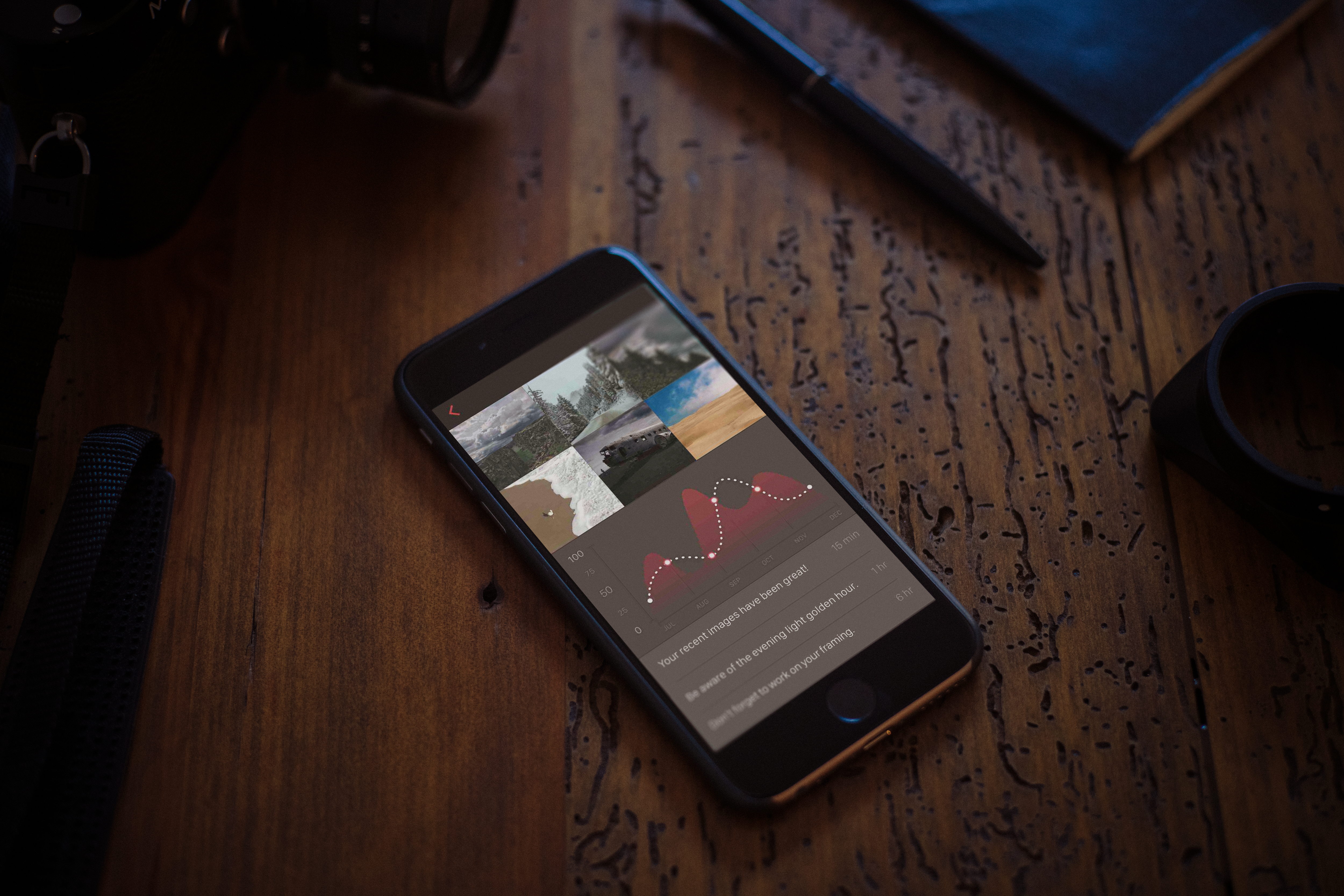 The mockup features a modern smartphone placed on a rustic wooden table, surrounded by a camera, pen, notebook, and wristband. The phone screen shows a user interface with various images and a chart. This setup offers an ideal way to showcase app designs, promoting productivity tools, or photo editing applications in a relatable work environment. Use this mockup generator to visualize your app and share your engaging design on social media! Start now and watch your creativity shine!