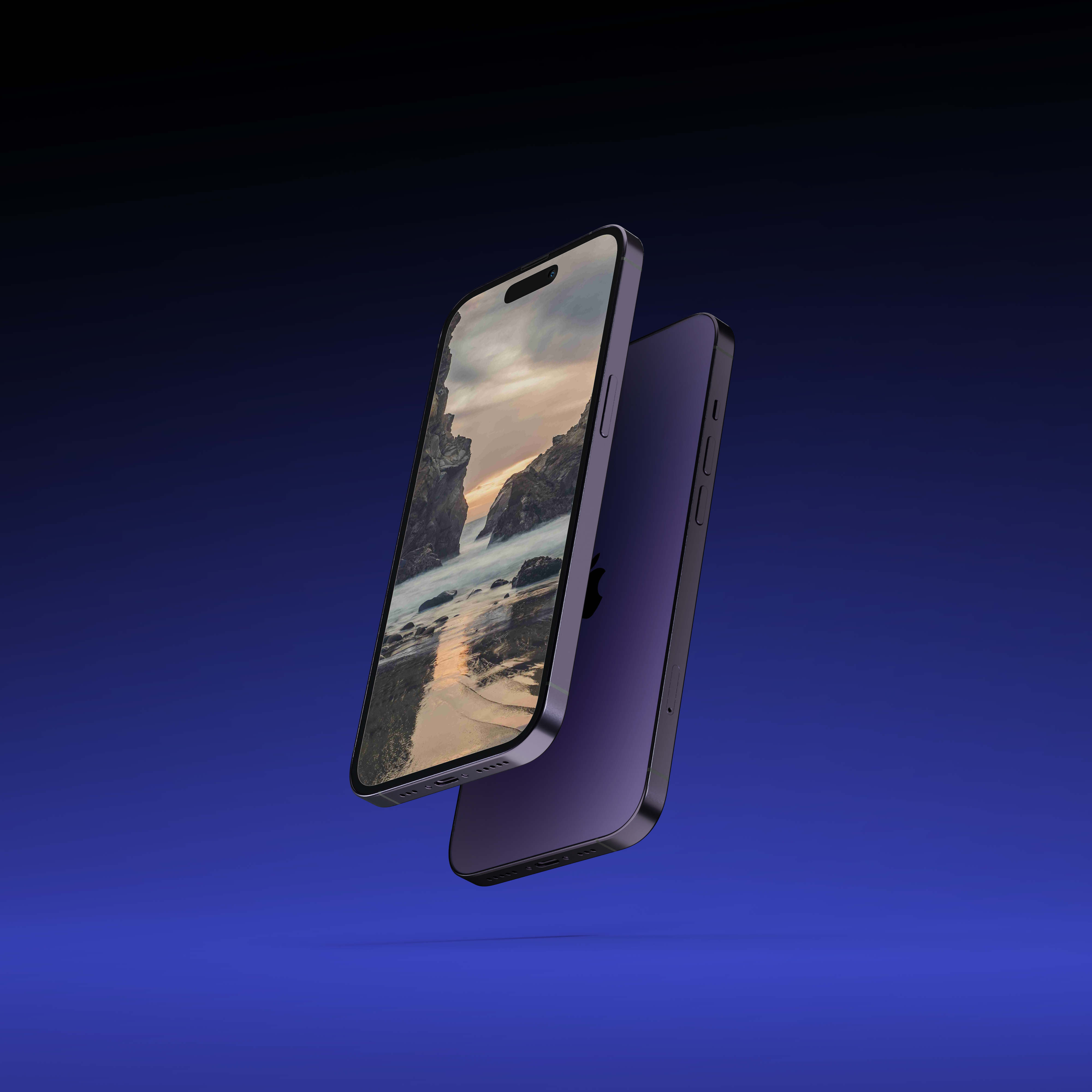 The mockup image features a sleek smartphone displayed in a floating position against a deep blue gradient background. The front screen showcases a serene coastal image, while the back of the phone is a sophisticated dark purple with subtle detailing. This mockup is ideal for advertising sleek and modern smartphone designs or software. Use this mockup generator to create stunning visuals and share your unique designs on social media to captivate your audience!
