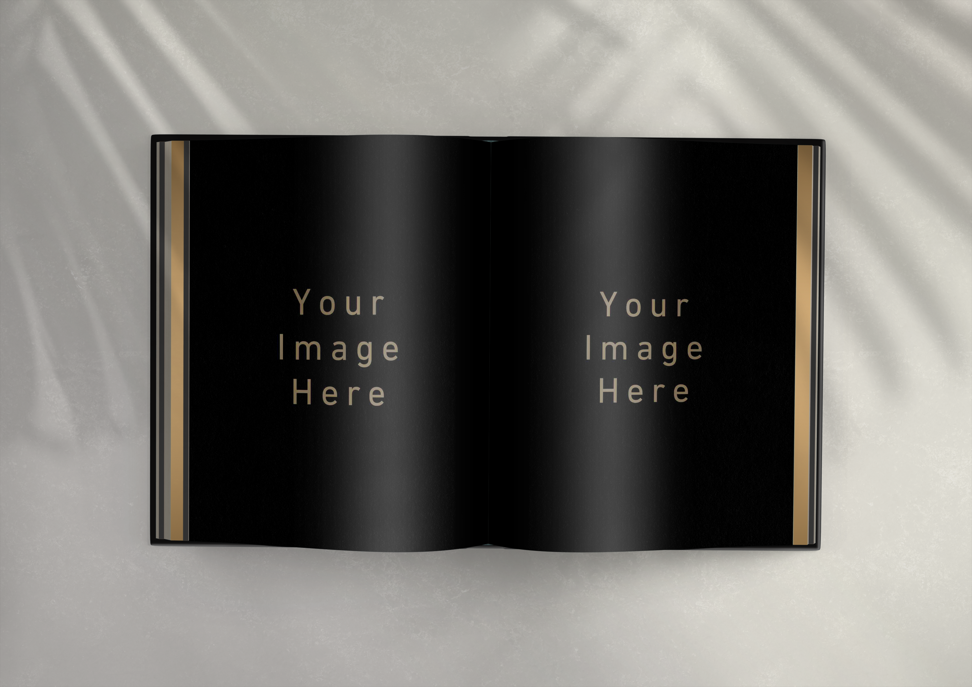 The mockup image features an open black booklet with gold accents on a light gray surface displaying faint shadow patterns. The booklet's pages are ready for custom images on both sides. This elegant and minimalistic mockup is perfect for advertising high-end products, fashion editorials, or premium services. Use it to create a striking visual presentation that commands attention. Try our mockup generator now and share your captivating designs on social media to expand your brand's reach!