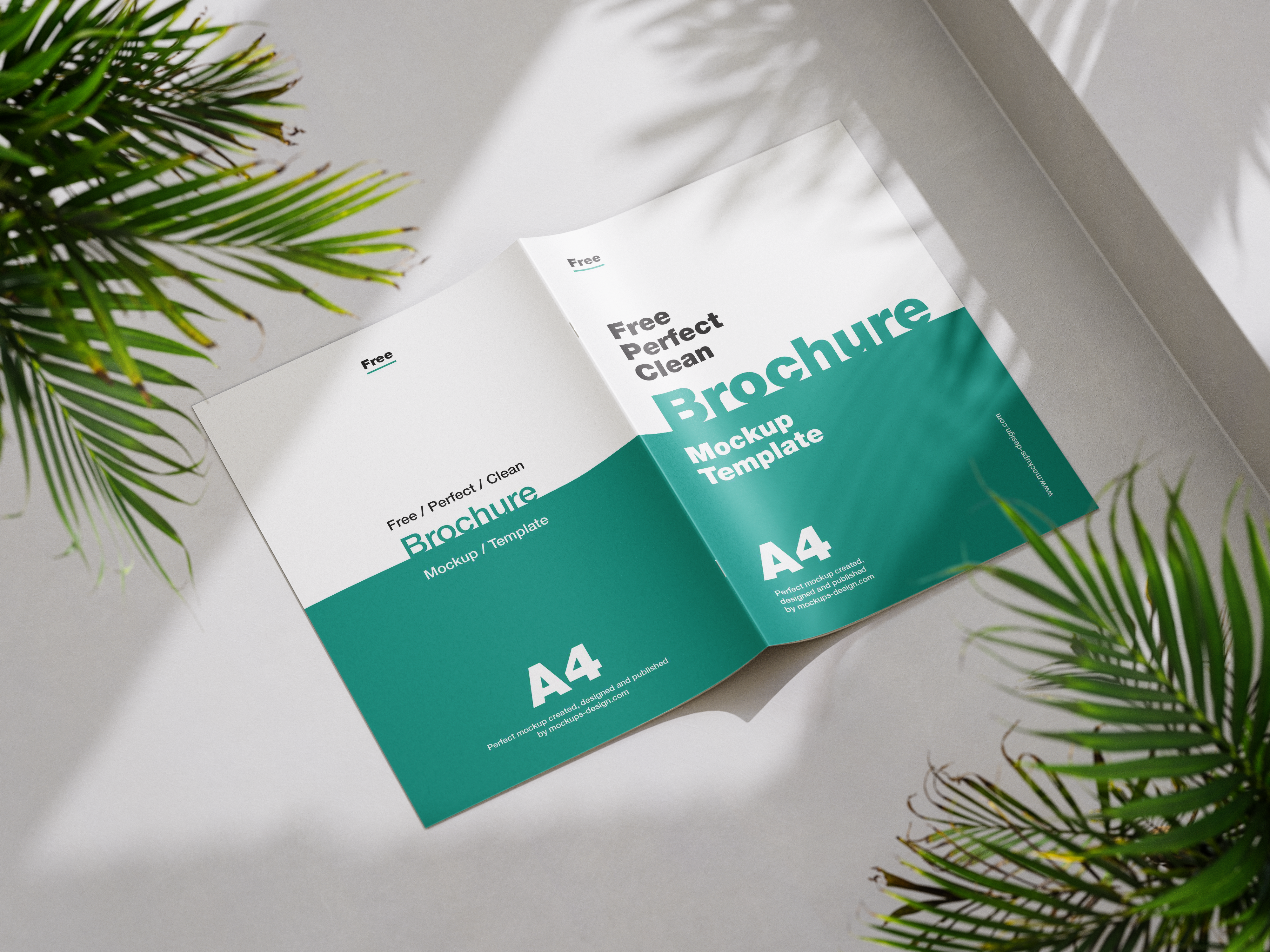 An open brochure mockup with teal and white design resting on a surface with shadows from fern leaves.