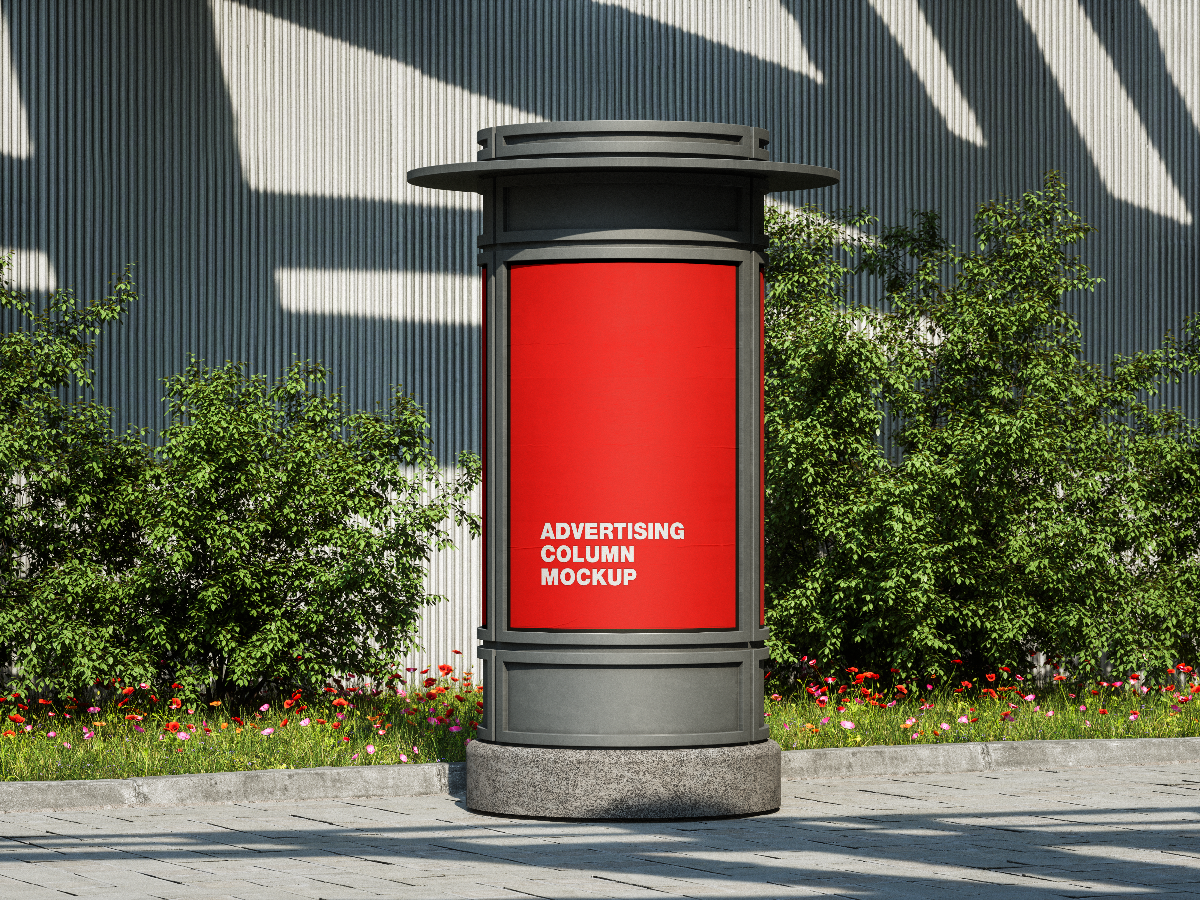 An outdoor advertising column with a red mockup reading "advertisement goes here" set against a backdrop of green shrubs and a striped building.